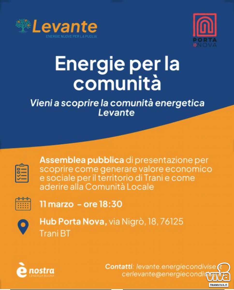 Trani, città di luce, sole e mare, compie un passo decisivo verso la sostenibilità, la giustizia sociale e la tutela del territorio. nasce ufficialmente la prima Comunità Energetica Rinnovabile (CER) della città, grazie all'impegno della Cooperativa di Comunità Porta Nova e all'affiliazione con CER Levante, la rete regionale che sostiene la diffusione delle CER in Puglia. A "Porta Nova" il prossimo𝟏𝟏 𝐦𝐚𝐫𝐳𝐨, 𝐨𝐫𝐞 𝟏𝟖.𝟑𝟎, 𝐯𝐢𝐚 𝐍𝐢𝐠𝐫𝐨̀ 𝟏𝟖, 𝐓𝐫𝐚𝐧𝐢, si terrà un incontro pubblico di presentazione della comunità energetica sulla nascente CER cittadina. Interverranno: