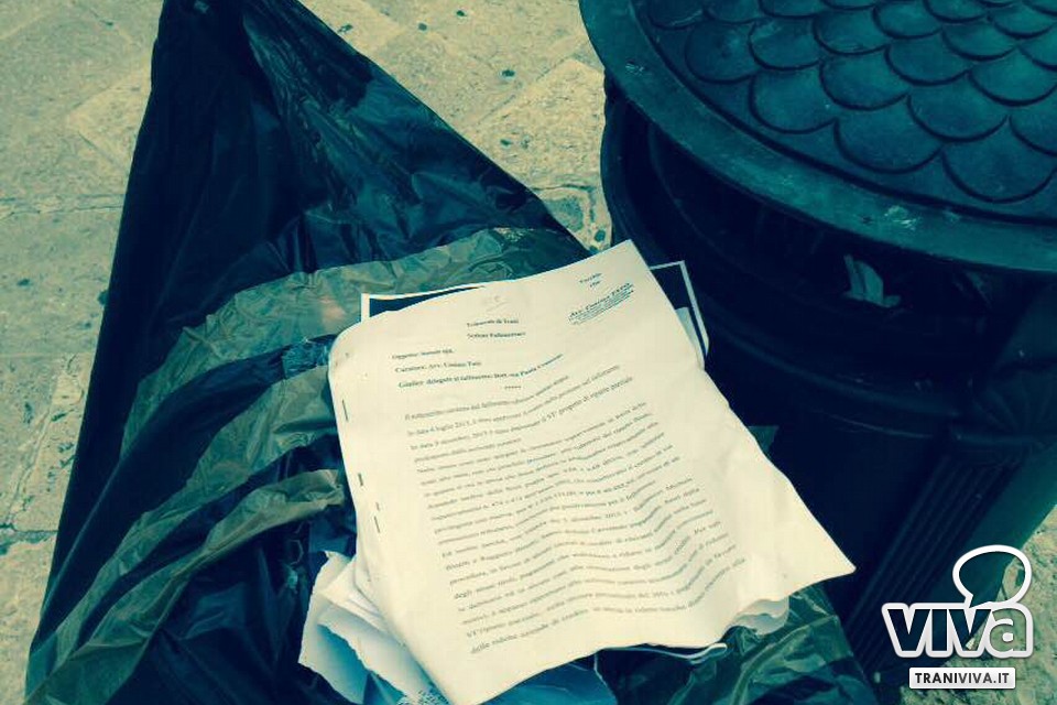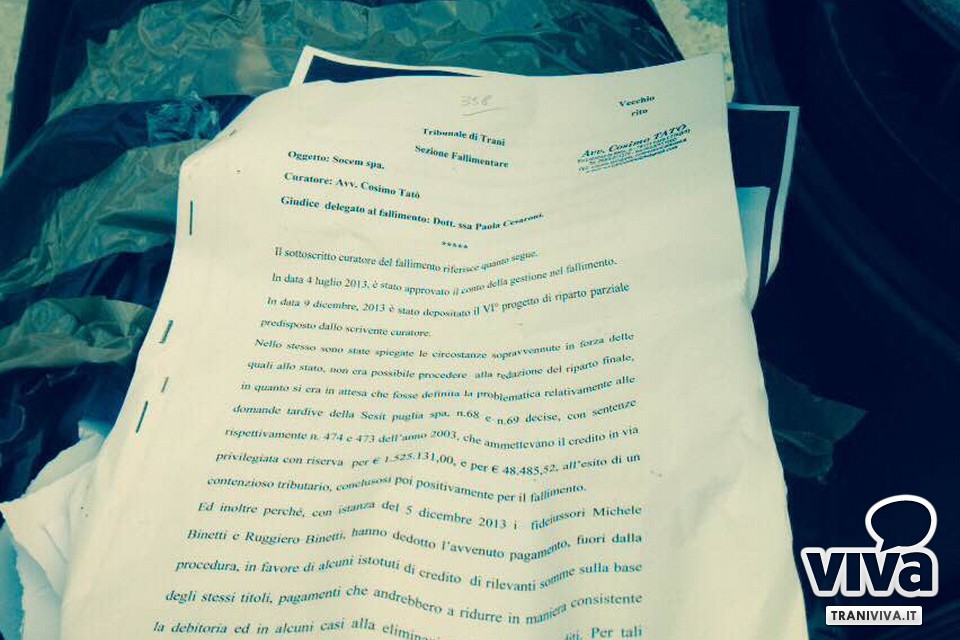 Abbandonati vicino un bidone dell'immondizia come semplici rifiuti, in realtà si tratta di atti della sezione fallimentare del Tribunale di Trani. Ecco quanto ci è stato denunciato, nella tarda serata di ieri, da un nostro lettore che per il secondo giorno consecutivo si è trovato ad assistere a questa scena.