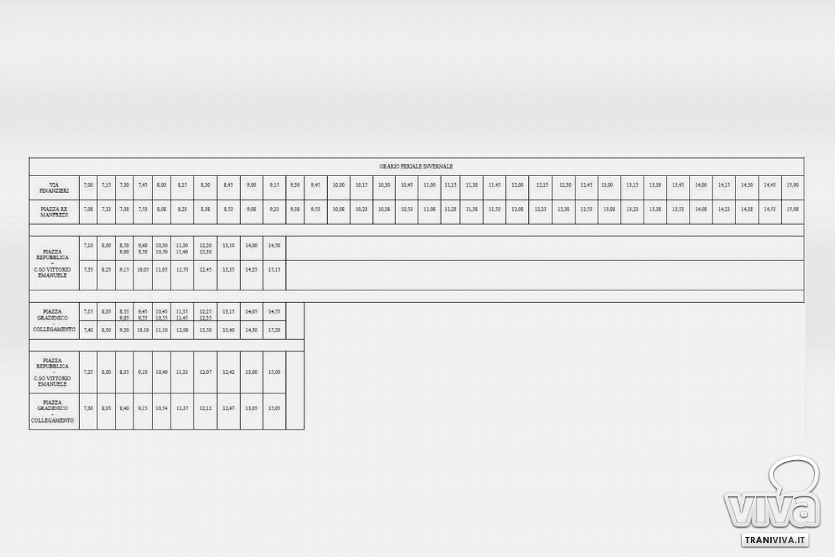- PARTENZA DA PIAZZA RE MANFREDI: 8,08; 8,23; 8,38; 8,53; 9,08; 9,23; 9,38; 9,53; 10,08; 10,23; 10,53; 11,08; 11,23; 11,38; 11,53; 12,08; 12,23; 12,38; 12,53; 13,08; 13,23; 13,38; 13,53; 14,08; 14,23; 14,38; 14,53