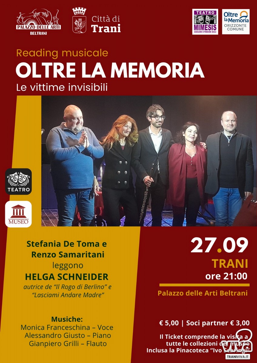 Ci sono serate che non si dimenticano perché scavano dentro. Oltre la memoria - Le vittime invisibili, in scena il prossimo 27 settembre, ore 21:00 (porta ore 20:30), al Palazzo delle Arti Beltrani di Trani(BT), è una di quelle. Un reading civile che non si accontenta di ricordare: pretende di risvegliare. Organizzato da Delle Arti Odv Ets, l'evento è un invito a guardare oltre le narrazioni ufficiali, là dove la storia si fa fragile, scomoda, vera.