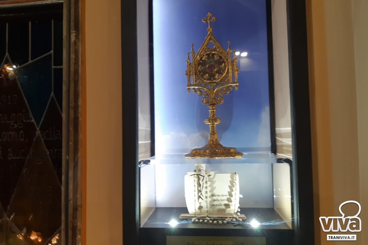 Nella prima nicchia si può ammirare una corona del Rosario realizzato da suor Lucia, una delle tre veggenti di Fatima. Si tratta della corona del Rosario che il vescovo di Fatima diede a padre Gerardo Onorato, fondatore del Santuario di Trani ed altri esponenti ecclesiastici presenti per l'occasione. Lucia dedicò personalmente questo Rosario, fatto con il legno dell'albero presso il quale apparve la Vergine a Fatima, ad un padre domenicano, al padre generale dei padri Rogazionisti e a mons. Addazi, vescovo di Trani. Erano i tempi della fondazione del nostro santuario dedicato alla Madonna di Fatima, il primo in Italia, secondo le notizie raccolte a suo tempo da Mons. Addazi, ed ora dal rettore padre Carlo.