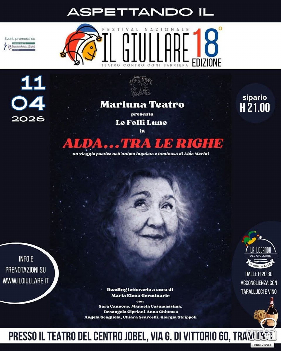 La poesia di Alda Merini torna a vivere sul palcoscenico, in una serata che promette emozioni profonde e suggestioni senza tempo. Sabato 11 aprile, presso il Teatro del Centro Jobel di Trani, andrà in scena "Alda… tra le righe", reading letterario a cura di Marluna Teatro con le Folli Lune, nell'ambito degli appuntamenti di avvicinamento alla XVIII edizione del Festival Il Giullare.Un evento che mette al centro la figura di Alda Merini, tra le voci più intense e autentiche della poesia italiana del Novecento. Poetessa capace di trasformare il dolore in bellezza, la fragilità in parola, Merini continua a parlare al cuore di generazioni diverse con una scrittura diretta, viscerale, profondamente umana. Il reading si propone come un viaggio tra i suoi versi, ma anche tra le pieghe della sua esistenza, restituendo al pubblico tutta la forza di una donna che ha fatto della poesia una forma di resistenza e verità.