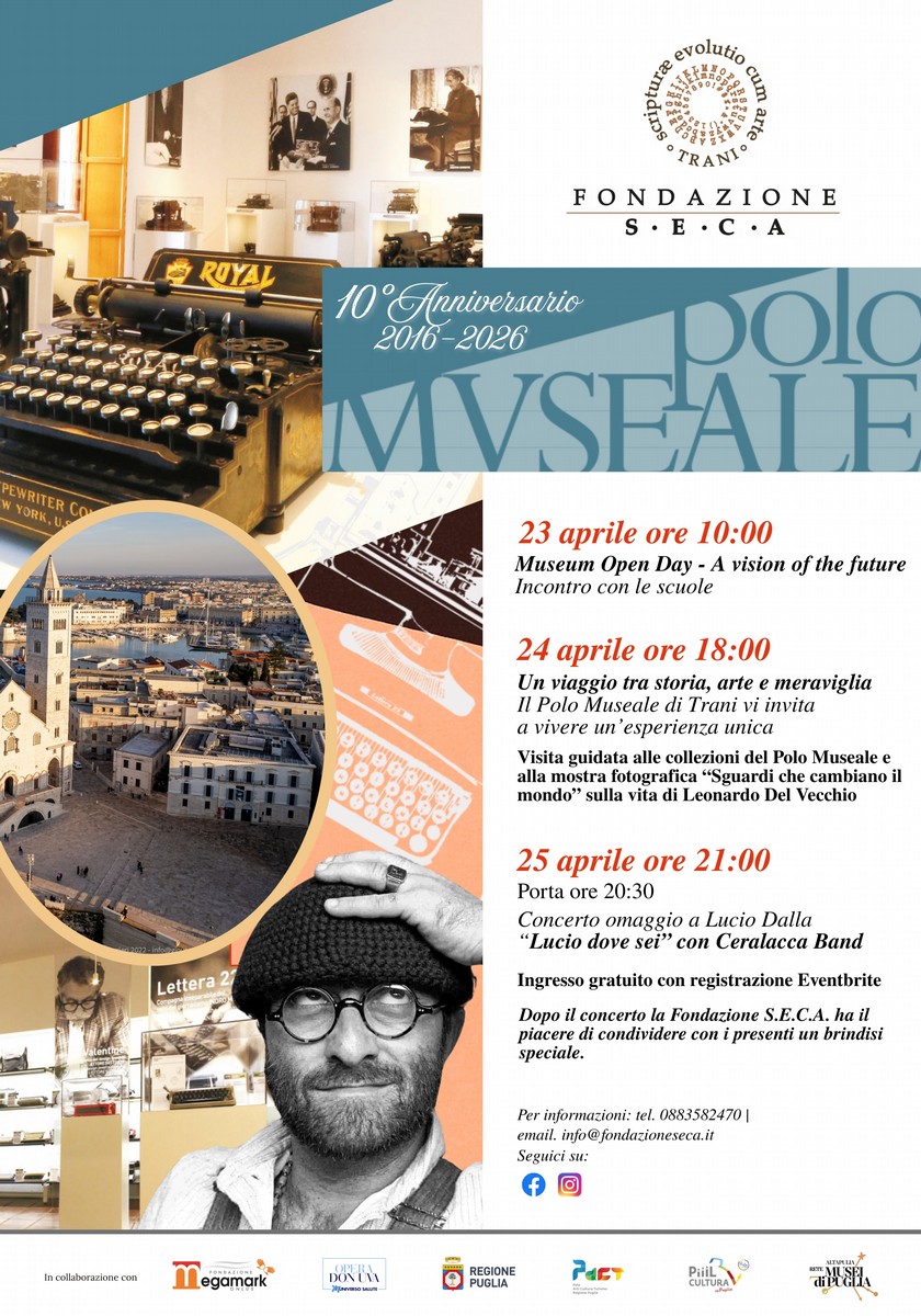 A dieci anni dalla sua nascita, la Fondazione S.E.C.A. celebra un traguardo significativo, segnando un decennio di impegno costante nella valorizzazione del patrimonio culturale e nella promozione dell'arte come strumento di crescita e dialogo. Il Polo Museale di Trani si conferma così un punto di riferimento per il territorio e per il panorama culturale nazionale, capace di coniugare tradizione e innovazione in un percorso che guarda al futuro senza dimenticare le proprie radici.