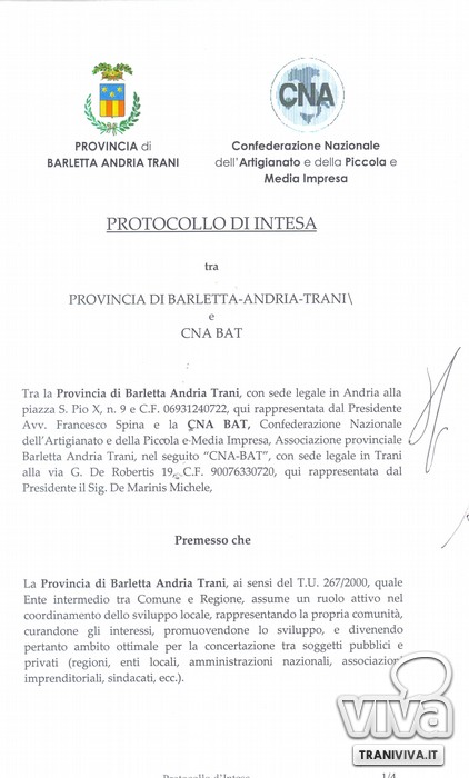 Con grande soddisfazione ed un pizzico di orgoglio, il presidente della Cna Bat, Michele De Marinis, ha comunicato che, in data 22 luglio 2015, è stato sottoscritto il protocollo di intesa tra la Provincia di Barletta-Andria-Trani e la Confederazione Nazionale dell'Artigianato e della Piccola e Media Impresa (Cna), per la costituzione di un Tavolo di Lavoro congiunto sulle tematiche ambientali. Il Tavolo di Lavoro, costituito da 3 delegati della Provincia ed altrettanti della Cna Bat, (per la Cna, oltre al presidente Michele De Marinis, ne fanno parte anche l'ingegner Marina Leuzzi e l'avvocato Gianluca Rosato) e presieduto dal dirigente del Settore Ambiente della Provincia, Vito Bruno, è finalizzato «alla condivisione delle "best practices", relative agli elaborati tecnici necessari alle domande di autorizzazione ambientale, nella predisposizione e presentazione della documentazione e in tutti gli interventi che migliorino, in un ottica sinergica, l'azione della Pubblica Amministrazione».
