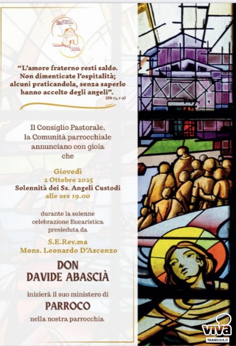 Giovedì 2 ottobre 2025, Solennità dei Ss. Angeli Custodi, a Trani, nella parrocchia Santi Angeli Custodi, alle ore 19.00, durante la celebrazione eucaristica presieduta dall'Arcivescovo mons. Leonardo D'Ascenzo, don Davide Abascià inizierà il suo ministero di parroco.