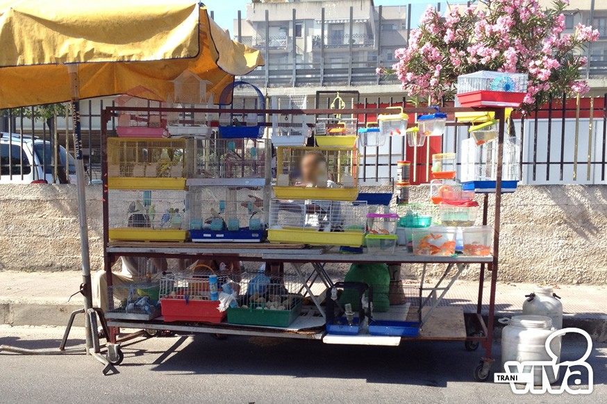 Conigli, pappagalli, pesci rossi, tartarughe, pulcini ed altri animali tenuti ammassati ed in condizioni vergognose su banchetti abusivi tenuti in vaschette piccolissime ed in gabbie assolutamente inadeguate dove gli animali sono ammassati in maniera vergognosa e lasciati con cibo inadeguato e acqua calda sotto il sole cocente. «Animali destinati ad essere venduti senza che nessuno delle forze dell'ordine o della polizia locale (che pure girano il mercato) sia mai intervenuto per sequestrarli e denunciare per maltrattamento di animali i venditori. Tutto questo accade ogni martedì al mercato comunale di Trani in Puglia».