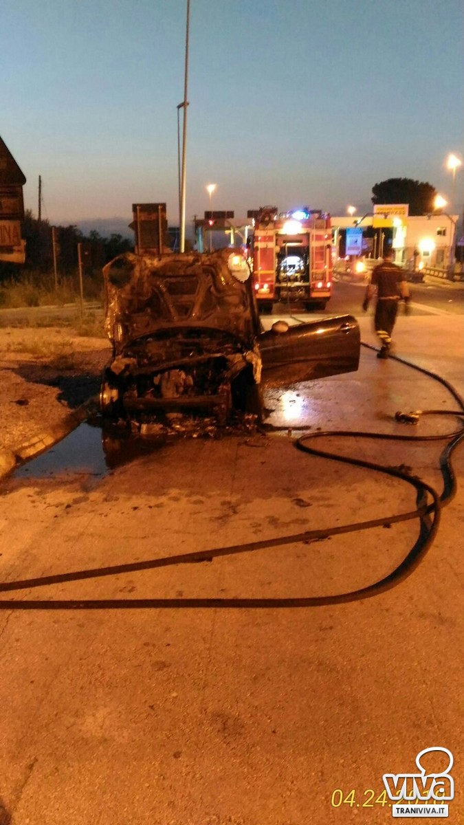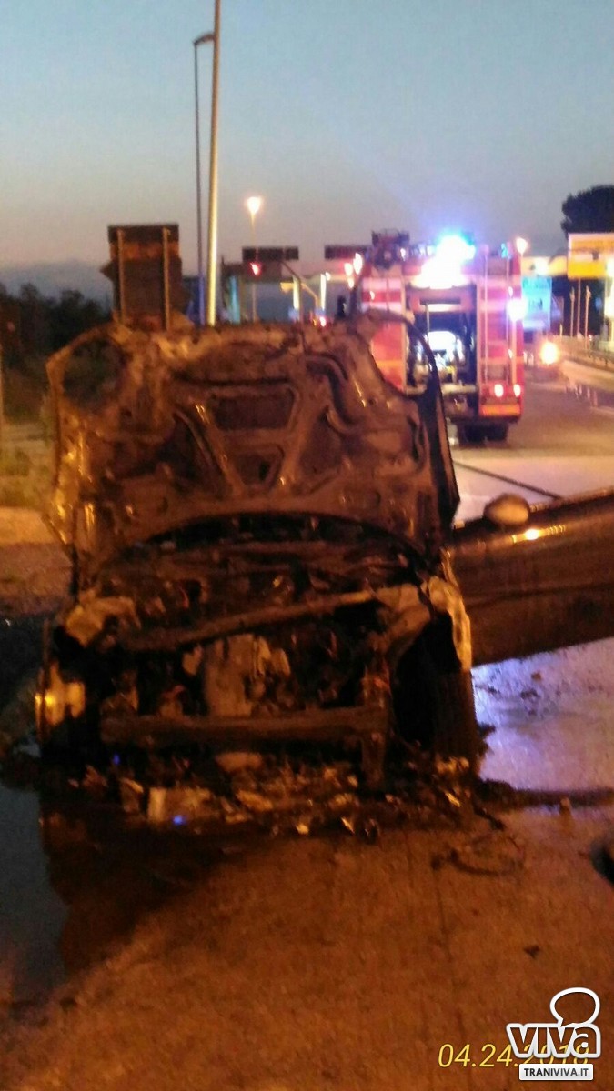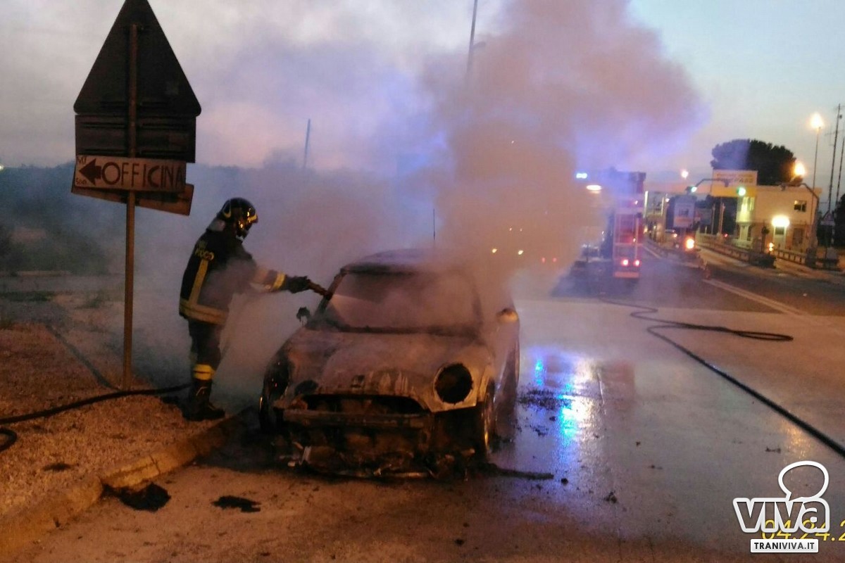 Auto in fiamme all'uscita del casello autostradale: illesi due tranesi