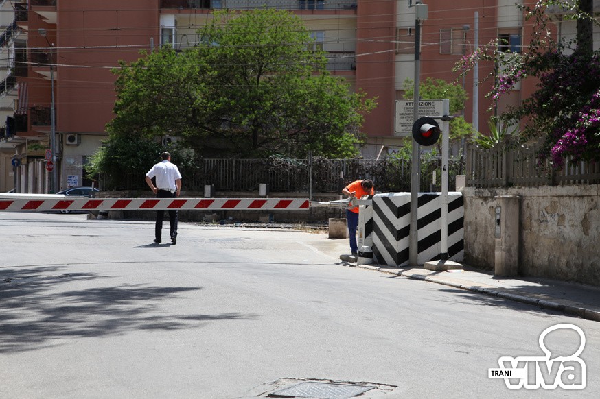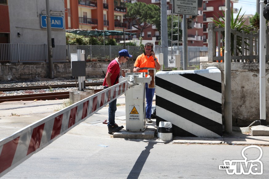 Polizia locale di Trani in azione per un guasto al sistema meccanico del passaggio a livello di via De Robertis causato da un automobilista che involontariamente ha urtato una sbarra.
