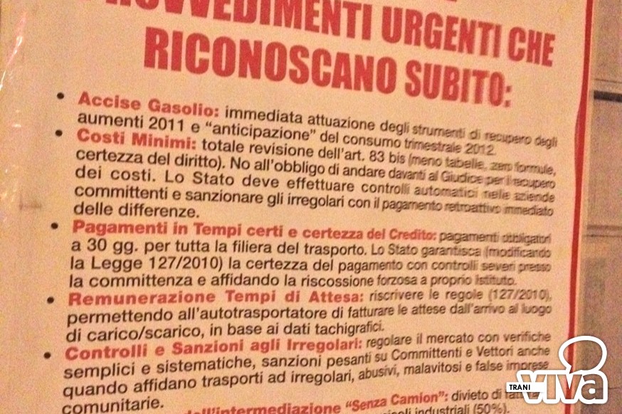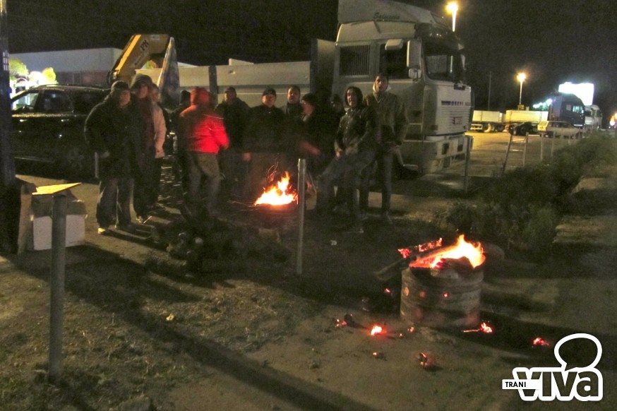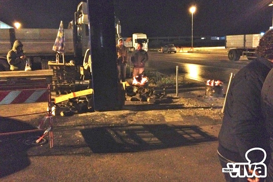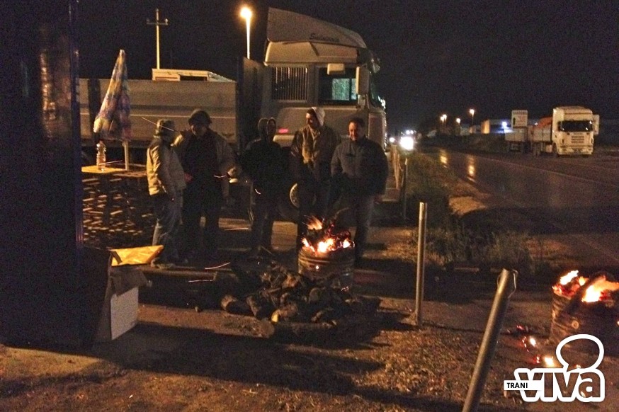 E' proseguita anche questa notte la protesta degli autotrasportatori (una quindicina) fermi da alcuni giorni sulla provinciale Trani-Andria. I manifestanti si sono difesi dal freddo con dei falò. Lo stato di fermo, iniziato ieri, resta confermato fino al 27 gennaio.