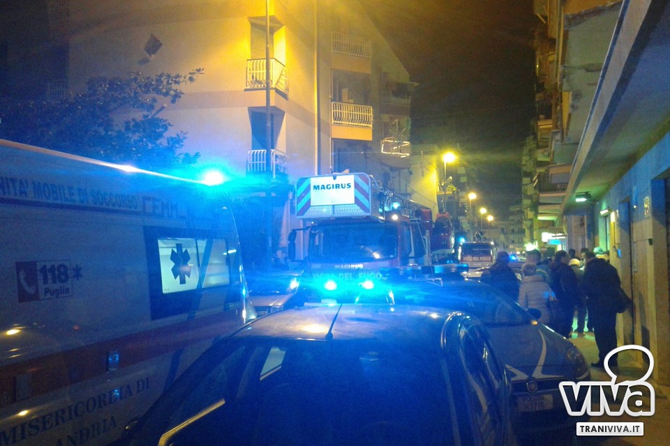 Una volta entrati in casa, questi hanno trovato la donna distesa sul letto priva di coscienza. Sul posto anche i soccorritori del 118 di Trani i quali hanno immediato fornito le prime cure mediche. È stato necessario bloccare completamente il traffico in via Dalmazia e in via Postumia per permettere ai due mezzi dei vigili del fuoco, all'ambulanza del 118 e ad una pattuglia della polizia di Stato di intervenire. La donna è stata trasportata in codice giallo in ospedale.