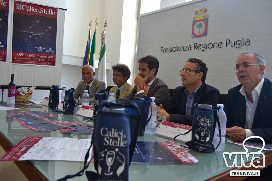 Motori accesi per l'organizzazione di Calici di Stelle, l'evento enogastronomico che, sotto le stelle di San Lorenzo, ogni anno coinvolge migliaia di residenti e turisti con degustazioni di ottimi vini e oli extravergine d'oliva, iniziative culturali e momenti di spettacolo. Due gli appuntamenti in programma per questa quindicesima edizione, come sempre ideata e organizzata in tutta Italia dal Movimento Turismo del Vino in collaborazione con l'associazione nazionale Città del Vino e reso possibile grazie al sostegno della Regione Puglia: martedì 6 agosto a Trani che si conferma punto di riferimento per il centro-nord della regione e sabato 10 agosto a Copertino (Le), splendida cittadina del Salento famosa per il culto di San Giuseppe, detto il Santo dei voli, e per il maestoso castello rinascimentale, importante esempio di architettura militare.Questa mattina la quindicesima edizione della manifestazione è stata presentata ufficialmente a Bari, presso la sede della presidenza della Regione Puglia. Per l'occasione sono intervenuti: Fabrizio Nardoni (assessore alle risorse agroalimentari della Regione Puglia), Sebastiano de Corato (presidente del Movimento turismo del vino Puglia), Luigi Nicola Riserbato (sindaco di Trani), Giuseppe Rosafio (sindaco di Copertino) e Cosimo Durante (presidente del Gal "Terra D'Arneo").