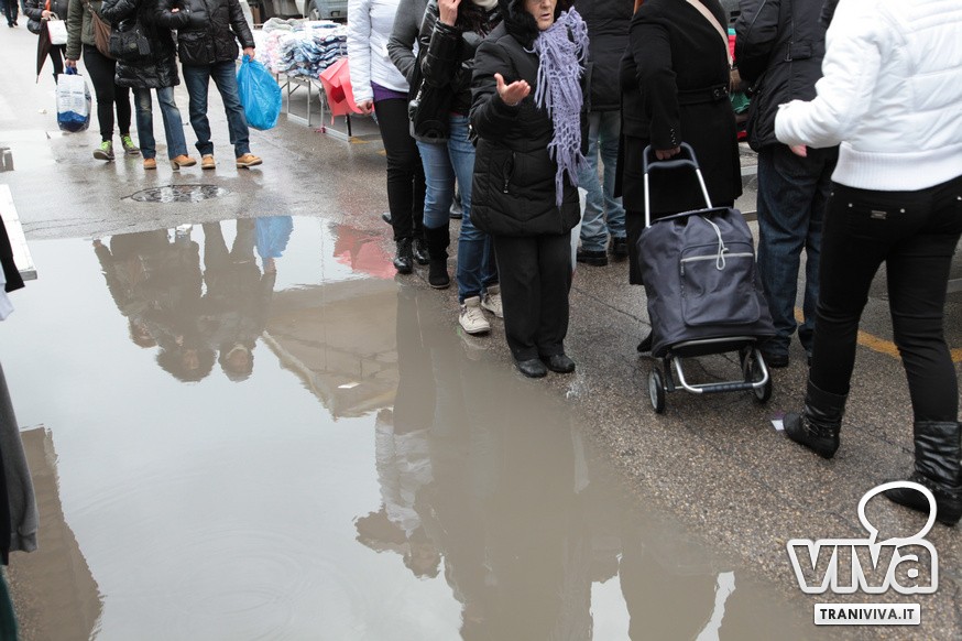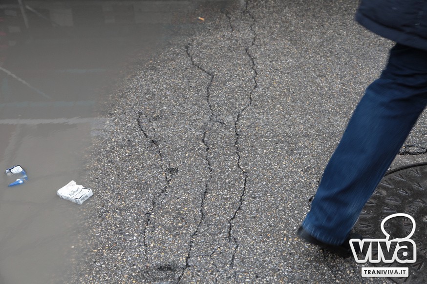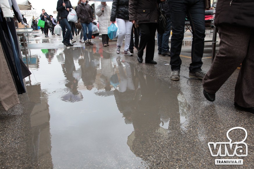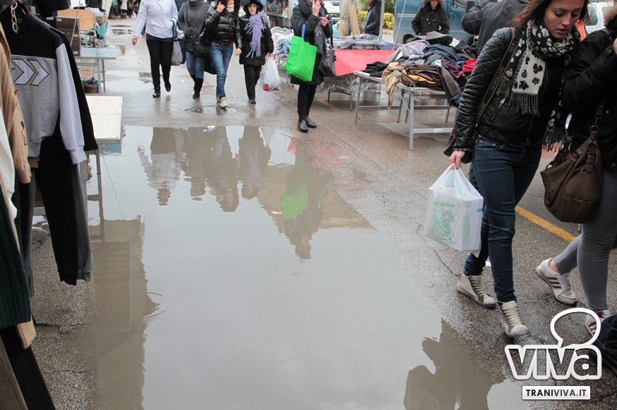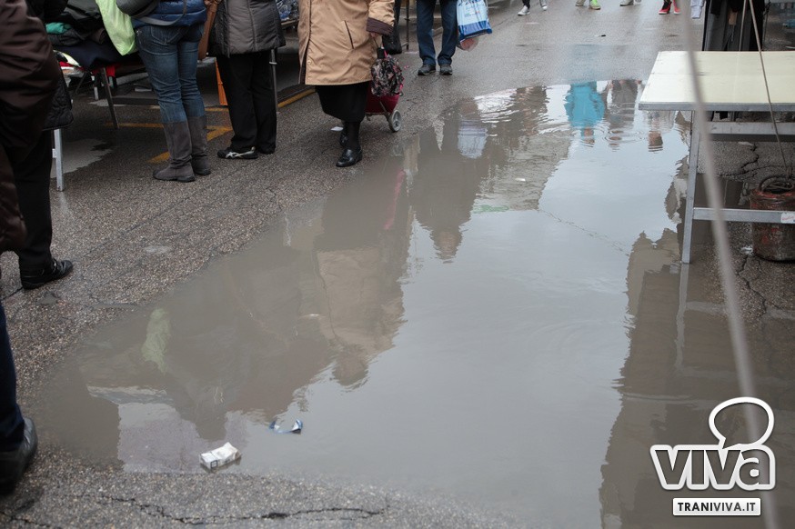 Il cedimento del manto stradale e le piogge delle scorse ore hanno creato numerosi disagi al mercato settimanale di Trani, in via Superga. L'avvallamento dell'asfalto tra via delle Tufare e via Cappuccini ha letteralmente allagato una porzione di strada rendendo difficile il passaggio degli utenti e creando non pochi problemi agli ambulanti.