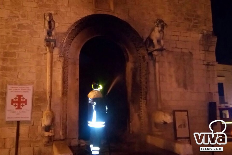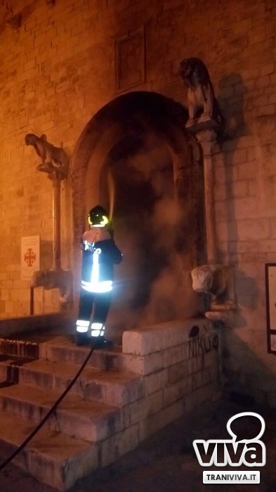 In fiamme una delle chiese più antiche di Trani. Sembrerebbe che, questa notte intorno all'1.15, alcuni vandali abbiano dato fuoco al portale della chiesa di San Giacomo (Santa Maria de Russis) chiesa risalente al dodicesimo secolo. Le fiamme erano altissime tanto da provocare una folta nube di fumo ben visibile anche da lontano. È stata proprio quest'ultima, accompagnata dal cattivo odore, ad allarmare i residenti della zona che hanno provveduto immediatamente a chiamare i vigili del fuoco.