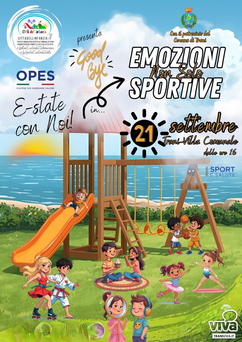 L'estate si chiude in bellezza con Città dell'Infanzia! Il 21 settembre, dalle 16 alle 20, la Villa Comunale di Trani si riempirà di vita, colori e sorrisi. Con il patrocinio del Comune di Trani e OPES Comitato Provinciale BARI, un pomeriggio dedicato a tutte le famiglie per esplorare il meraviglioso mondo dello sport e della creatività. Sarà un'immersione completa in judo, lotta, ginnastica artistica, pattinaggio, basket, danza ma anche stimolazione sensoriale con attività di cake design, make-up, arte... e benessere con la consulenza pedagogica. L'occasione perfetta per condividere emozioni e creare legami in un'atmosfera dai mille colori. GoodBye E-State con noi...in emozioni NON SOLO sportive, per celebrare la vita, i ricordi e le esperienze Alcuni lab sono a numero chiuso. Ci sarà una postazione aperta dalle ore 15,30 per prenotazioni in ordine di arrivo. L'evento è gratuito. Programma e mappa evento su https://cittadellinfanzia.it/programma.php .