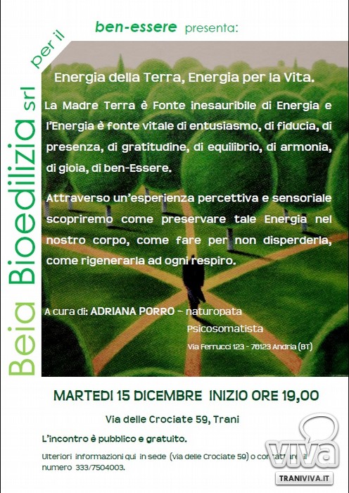 Questa sera, alle ore 19, presso il percorso espositivo organizzato da Beia Bioedilizia srl in via Delle Crociate 59 a Trani, si terrà l'incontro su "Energia della Terra, Energia per la Vita" a cura di Adriana Porro, naturopata e psicosomatista.