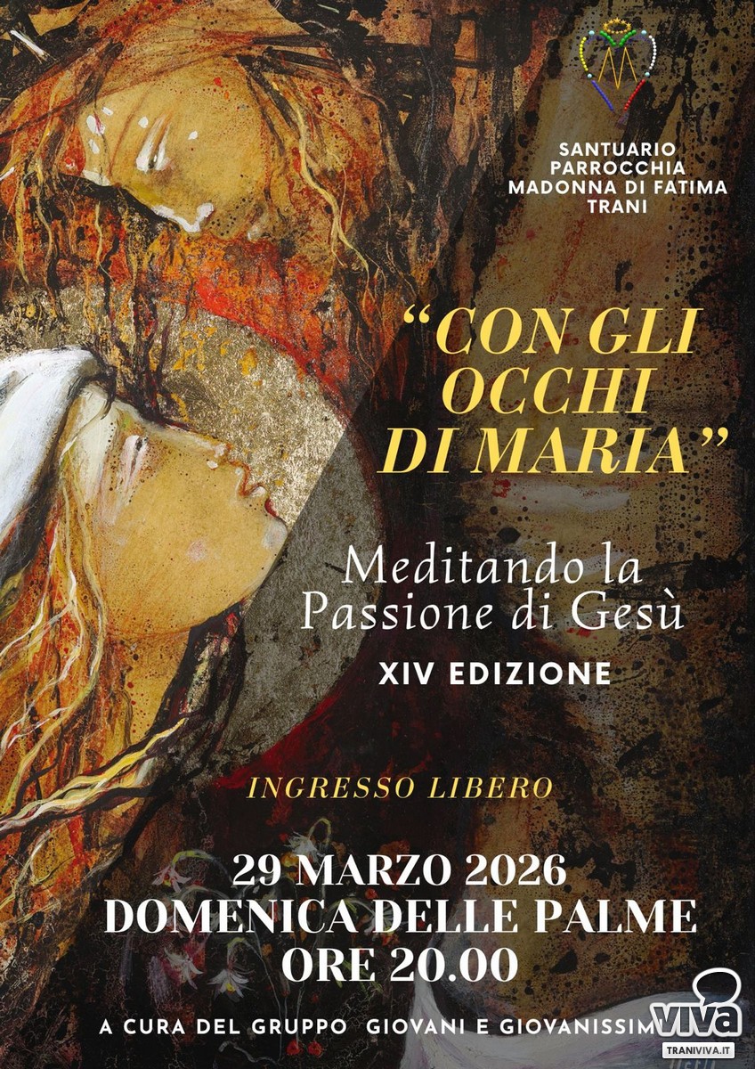Un appuntamento che unisce spiritualità, tradizione e partecipazione giovanile. Torna anche quest'anno a Trani "Con gli occhi di Maria", la meditazione sulla Passione di Gesù giunta alla sua XIV edizione. L'iniziativa si terrà domenica 29 marzo 2026, in occasione della Domenica delle Palme, alle ore 20.00 presso il Santuario-Parrocchia Madonna di Fatima. A curare il momento di preghiera saranno i gruppi giovani e giovanissimi della parrocchia, protagonisti di un percorso spirituale che invita a rileggere la Passione di Cristo attraverso lo sguardo e la sensibilità di Maria.