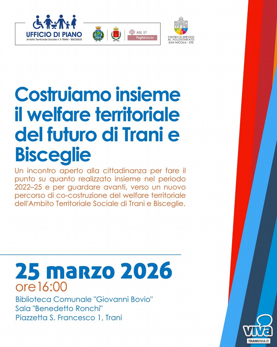 L'Ambito Territoriale Sociale di Trani - Bisceglie invita la cittadinanza a partecipare all'evento pubblico "Costruiamo insieme il welfare territoriale del futuro di Trani e Bisceglie", in programma il 25 marzo 2026, alle ore 16.00, presso la Biblioteca Comunale "Giovanni Bovio" - Sala "Benedetto Ronchi", in Piazzetta S. Francesco 1, Trani.