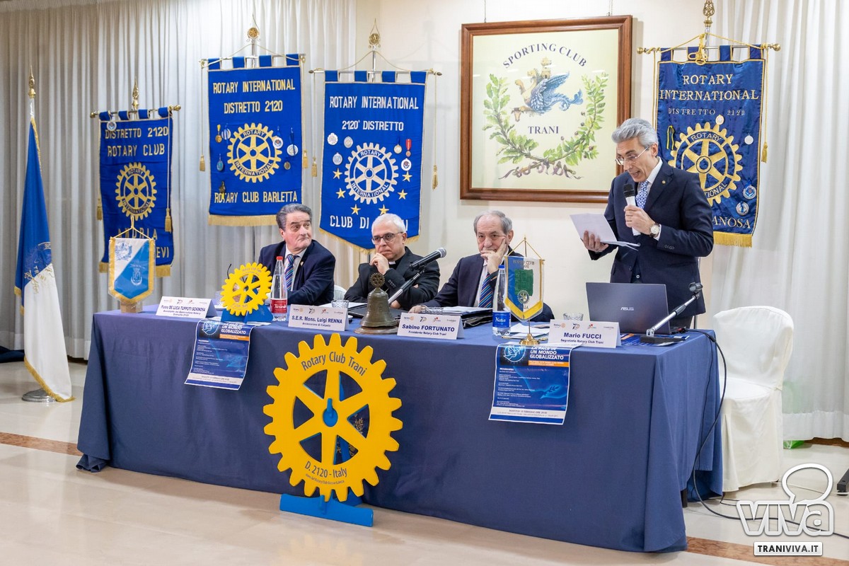 Di pace nel mondo odierno si è parlato nell'evento organizzato dal Rotary Club di Trani e che è stato ospitato dallo Sporting Club tranese. Il relatore della serata è stato S.E.R. mons. Luigi Renna, Arcivescovo di Catania, che ha svolto una disamina molto accurata del tema, partendo proprio dalla definizione di mondo globalizzato. La civiltà prende le mosse dalla mitologia e dalla letteratura più antiche, in cui già sono presenti le prime norme che regolano il rapporto tra gli attori istituzionali presenti sulla scena internazionale.