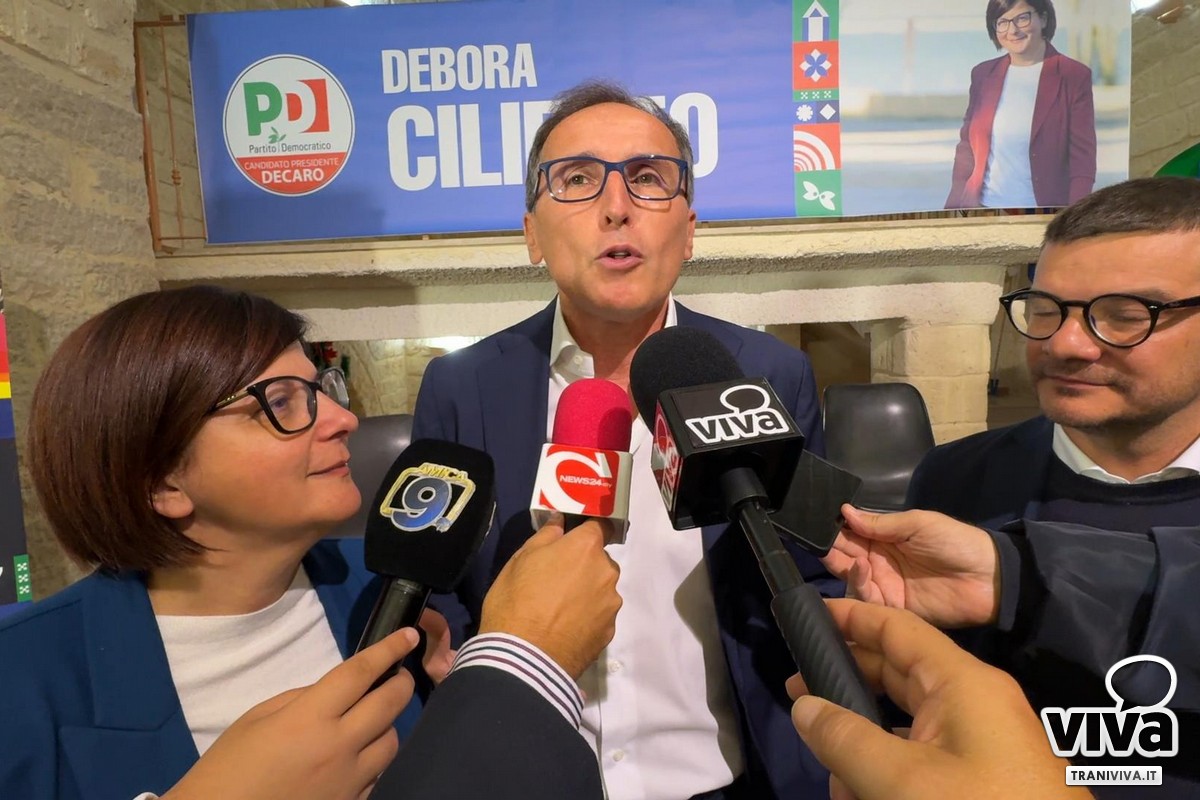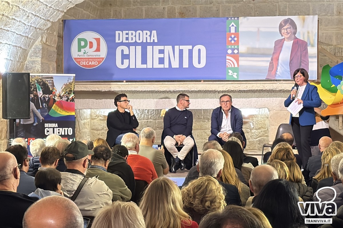 Il Partito Democratico ha serrato i ranghi ieri, 17 ottobre, a Trani, nell'incontro pubblico promosso dall'Assessora regionale ai Trasporti, Debora Ciliento, per discutere delle prospettive di sviluppo della Puglia. Al suo fianco, i vertici nazionali e regionali del partito: il capogruppo al Senato Francesco Boccia, il segretario regionale Domenico De Santis e il commissario provinciale Dario Parrini. Un incontro che ha visto la presenza dei sindaci Amedeo Bottaro (Trani) e Michele Lamacchia (San Ferdinando di Puglia), impreziosito dall'intervento a sorpresa del candidato Presidente del centrosinistra, Antonio Decaro, che nell' intervento ha tracciato tra le sue priorità, la riduzione dei divari interni alla regione e il sostegno all'economia locale, ma soprattutto ha richiamato all'esercizio del voto: "Sulla scheda non il segno su un simbolo o la scrittura di un nome, ma il disegno del futuro della Puglia. Andate a votare, votate per noi".