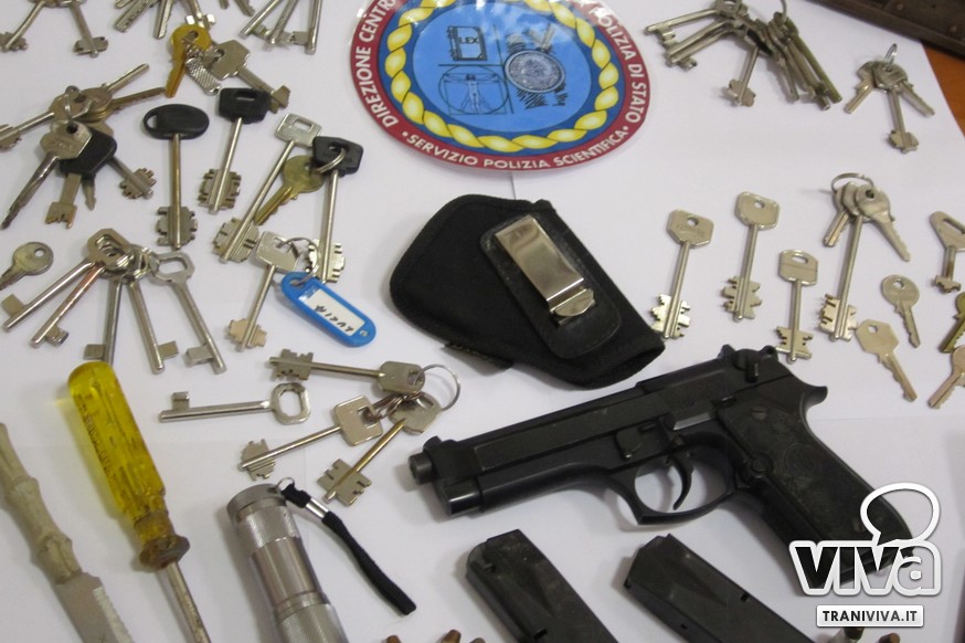Deteneva nella sua abitazione, in macchina e all'interno di uno scooter di sua proprietà una pistola calibro 9 x 21 completa di matricola (sottratta nel corso di una rapina del febbraio del 2012 ad una coppia di anziani di Trani), due caricatori con 16 proiettili, una fondina per pistola, una corda per arrampicata di 14 metri con gancio metallico e ben 71 chiavi di serratura per porte di abitazione.