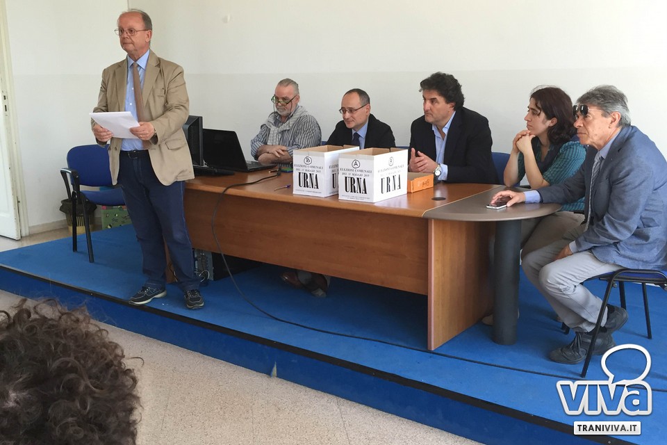 Ecco l'ordine delle liste sui manifesti elettorali: 1) Area Popolare; 2) Forza Italia; 3) Prima di Tutto Trani; 4) Tonino Florio Sindaco; 5) Fratelli d'Italia - An; 6) Trani a Capo; 7) Movimento 5 Stelle; 8) Trani Like; 9) Nuovo Centro-Destra; 10) Buongiorno Trani; 11) Partito Democratico; 12) Trani Futura; 13) Noi a Sinistra; 14) Più Trani; 15) Realtà Italia; 16) Procacci Sindaco; 17) Emiliano - Il Sindaco di Puglia; 18) Verdi; 19) Trani Libera; 20) Insieme per Tomasicchio.