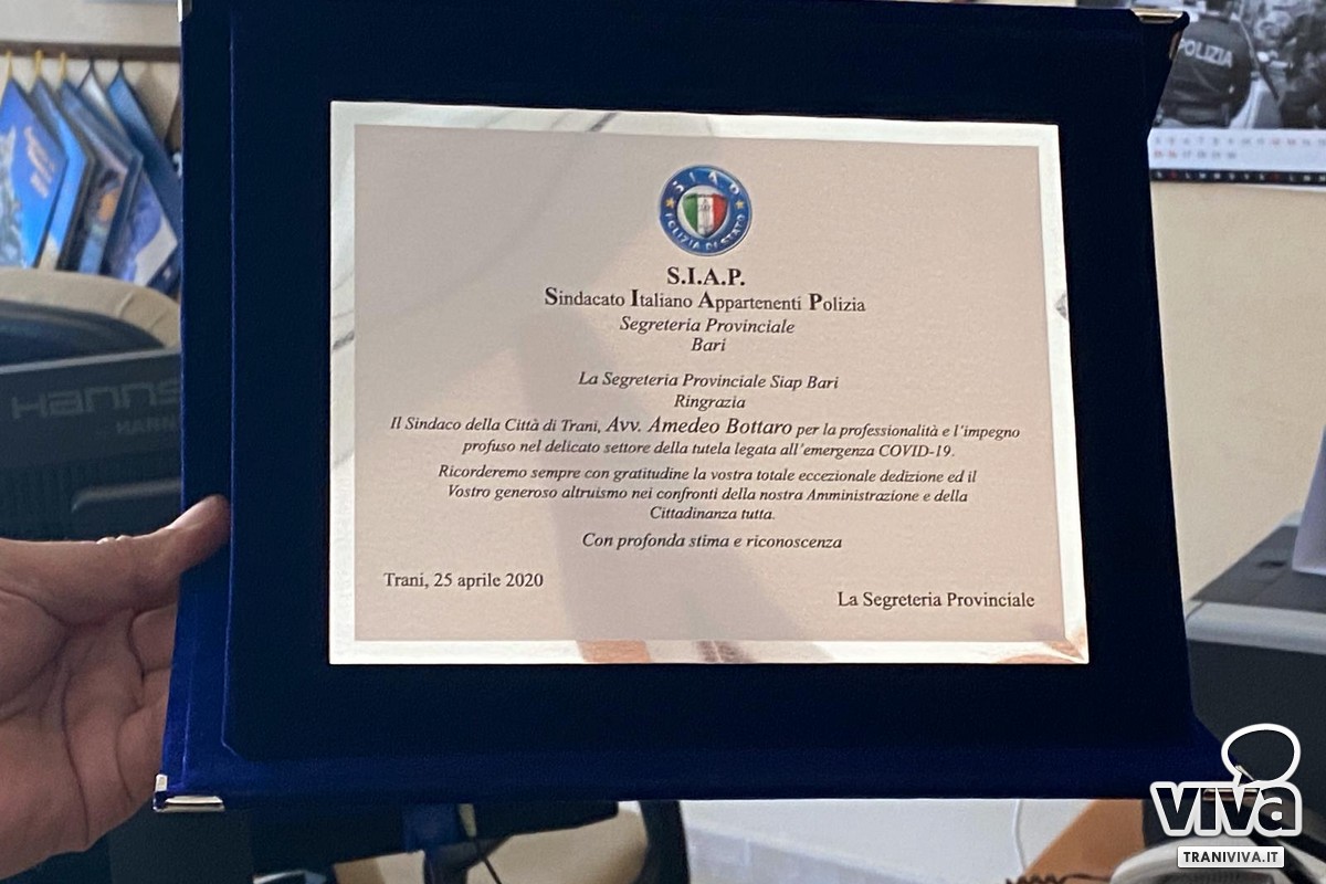 Nel giorno della Liberazione, il sindaco di Trani, Amedeo Bottaro, il comandante della Polizia Locale di Trani, Leonardo Cuocci Martorano, e il Dirigente del Commissariato di P.S. di Trani, Dott. Francesco Triggiani, hanno ricevuto una targa di ringraziamento fatta realizzare dalla Segreteria Provinciale di Bari del Sindacato Italiano Appartenenti Polizia (S.I.A.P.) per sottolineare l'impegno profuso in queste settimane di emergenza covid-19.
