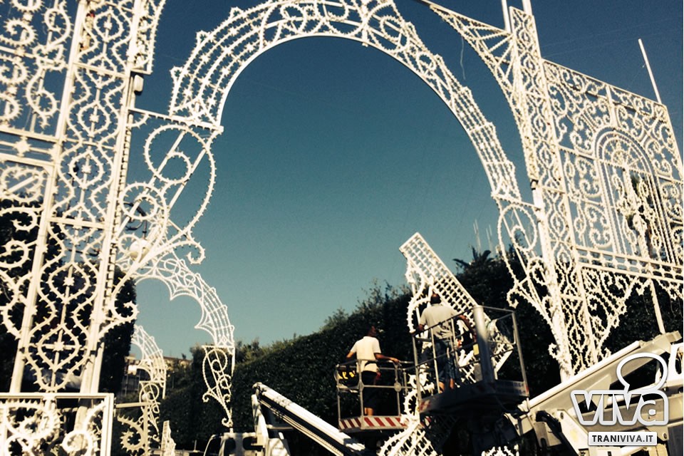 Le luminarie - nella foto la fase di installazione del portale di piazza della Repubblica - quest'anno sono a cura della ditta "Paulicelli" di Capurso. Nell'agenda di TraniViva il programma dettagliato.