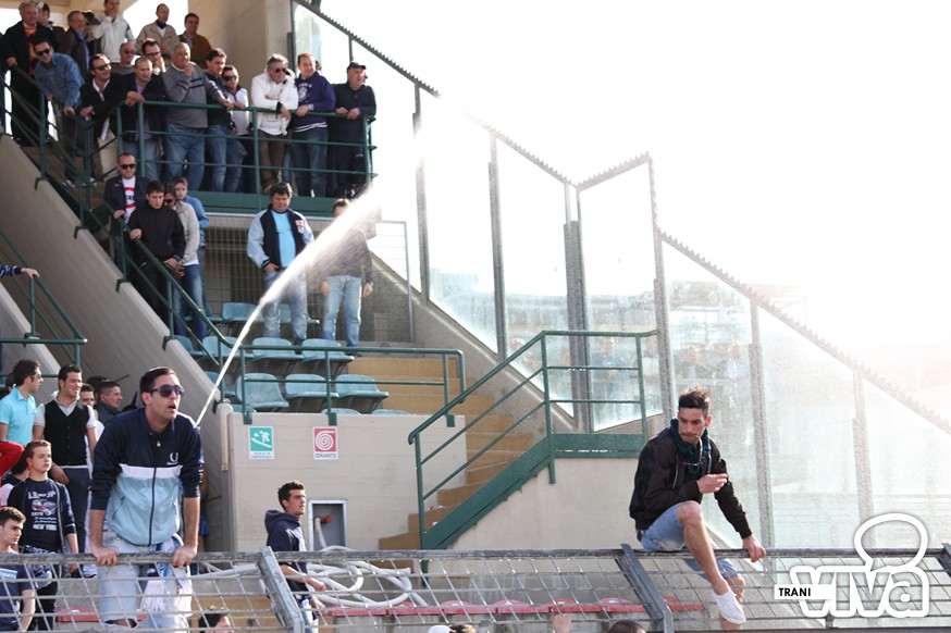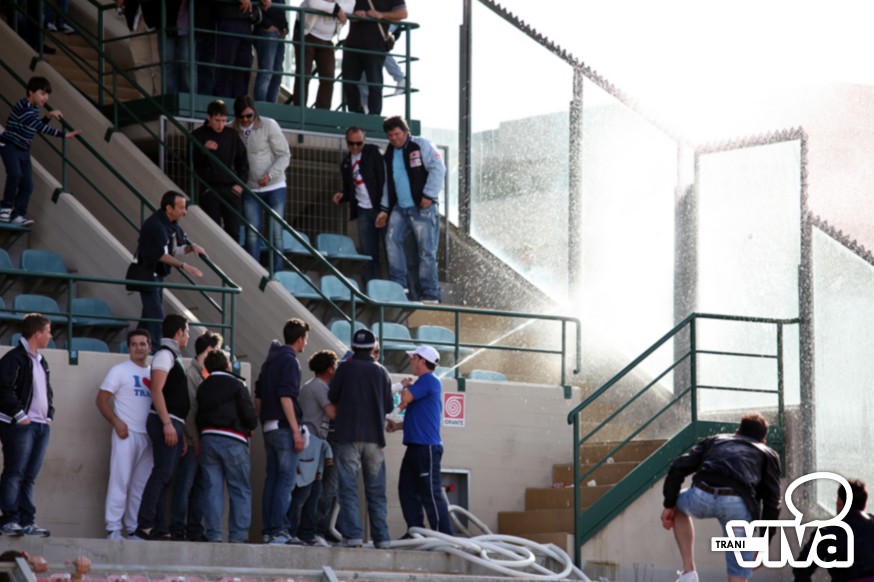 Una sciocchezza che potrebbe costare la squalifica di campo per l'ultima gara interna della stagione, quella con l'Ostuni, in programma l'1 maggio. Al fischio finale di Trani-Francavilla, dalla tribuna viene azionato l'idrante dell'impianto anti-incendio. Il getto d'acqua, rivolto verso il campo, impedisce per alcuni minuti il rientro negli spogliatoi della terna arbitrale e della squadra avversario. Il campo del Trani (già in diffida) potrebbe essere squalificato.
