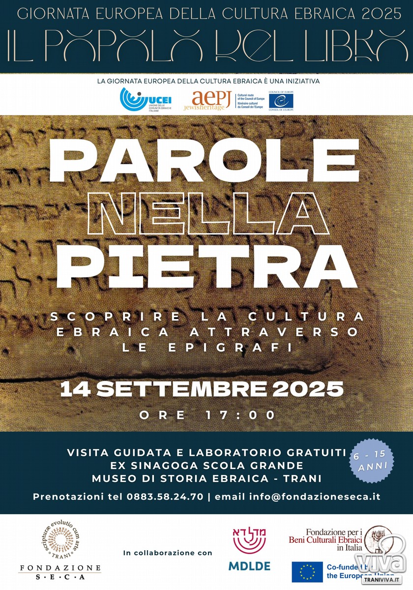 La Fondazione S.E.C.A. e il Polo Museale Diocesano di Trani per l'occasione promuovono un'attività inserita nella programmazione ufficiale dal titolo "Parole nella Pietra" dedicata a bambini e ragazzi dai 6 ai 15 anni. Prevista dapprima la visita guidata all'Ex Sinagoga Scola Grande – Museo di storia ebraica e successivamente un laboratorio di scrittura di un'epigrafe immaginaria, partendo dalla traduzione e comprensione di quella di fondazione conservata all'interno del Museo, espressione tangibile del patrimonio della cultura ebraica tranese e pugliese.