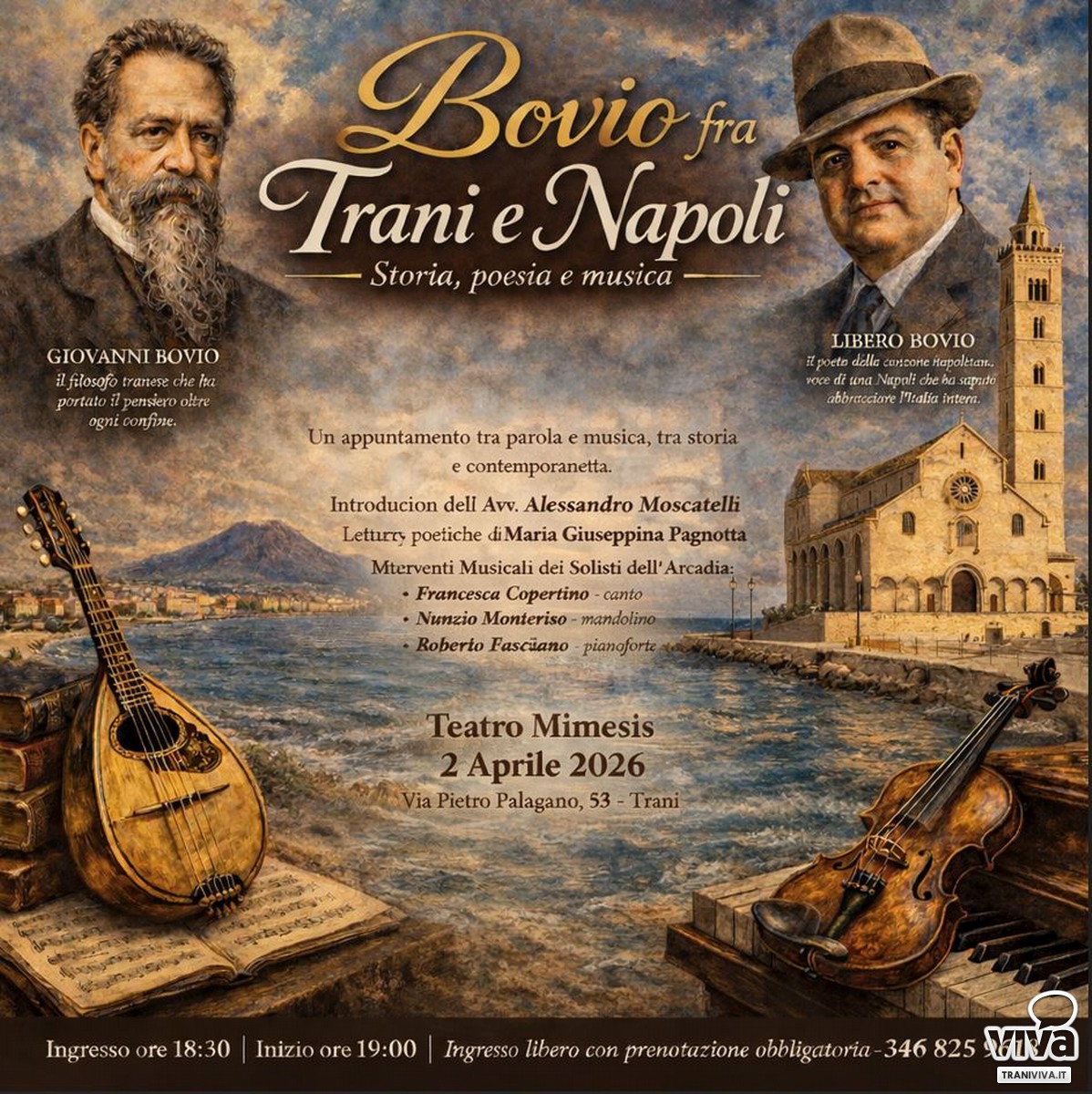 Ad aprire la serata sarà l'introduzione dell'Avv. Alessandro Moscatelli. Le letture poetiche saranno affidate a Maria Giuseppina Pagnotta. Gli interventi musicali saranno a cura dei Solisti dell'Arcadia: Francesca Copertino – canto - Nunzio Monteriso – mandolino - Stefania Lomolino – violino - Roberto Fasciano – pianoforte "Bovio fra Trani e Napoli" si propone non solo come spettacolo, ma come momento di riflessione e condivisione culturale, capace di unire tradizione e contemporaneità in un'unica visione artistica. L'appuntamento è fissato per le ore 19:00 (ingresso ore 18:30). L'ingresso è libero con prenotazione obbligatoria.