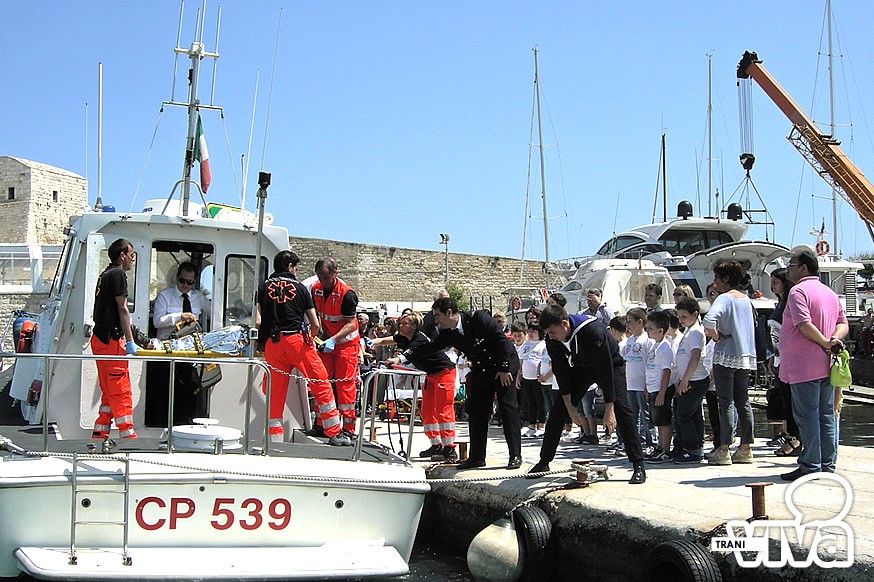 Protagonisti della giornata, 50 alunni del secondo circolo della scuola Petronelli di Trani. Accompagnati dalla dirigente Giuseppina Tota, i giovani studenti hanno potuto apprendere le regole per un corretto approccio al mare nel rispetto delle norme che garantiscono una tranquilla navigazione sia per i bagnanti che per i diportisti. In più, hanno potuto partecipare ad una simulazione di soccorso in mare, scoprendo le varie fasi della scala del soccorso che vengono applicate in situazioni di emergenza.