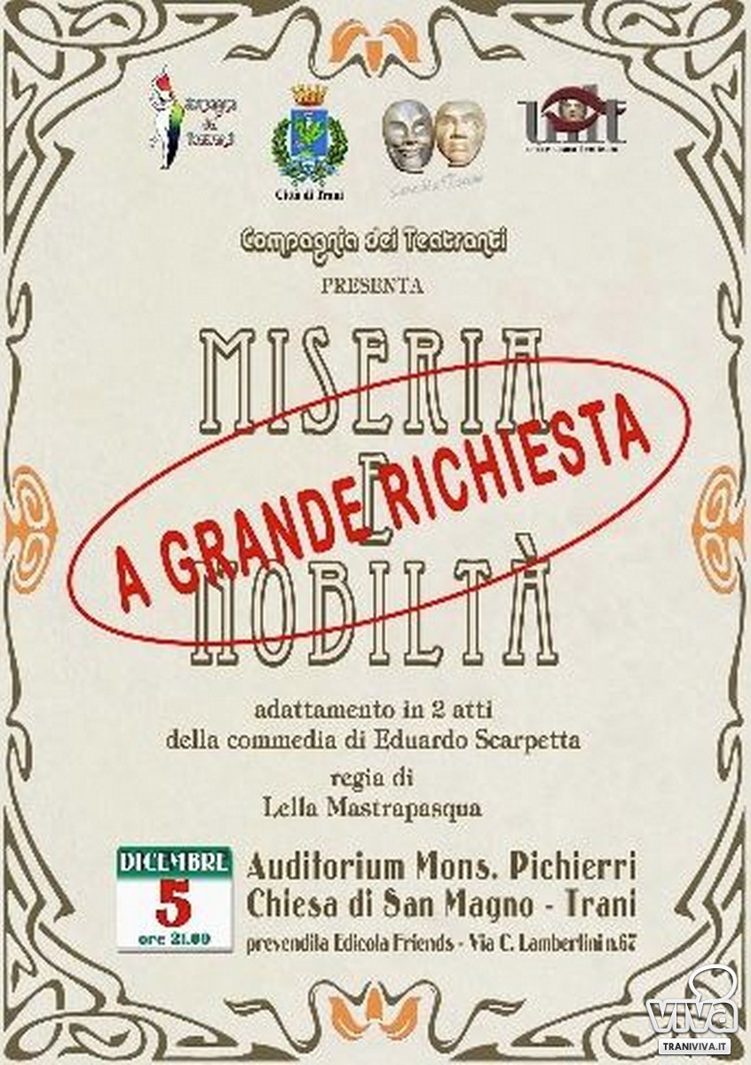 Cala il sipario sulla VII edizione della rassegna nazionale "Venerdì a Teatro", e lo fa nel modo più fragoroso e nobile possibile: con una risata che attraversa i secoli. Venerdì 5 dicembre, alle ore 21, l'Auditorium San Magno ospiterà l'ultimo appuntamento di una stagione da record, portando in scena uno dei testi sacri del teatro napoletano e italiano: "Miseria e Nobiltà" di Eduardo Scarpetta. L'evento, co-organizzato dalla Compagnia dei Teatranti e dal Comune di Trani (con il patrocinio dell'Unione Italiana Libero Teatro), non è solo la chiusura di un cartellone, ma una vera e propria festa teatrale.