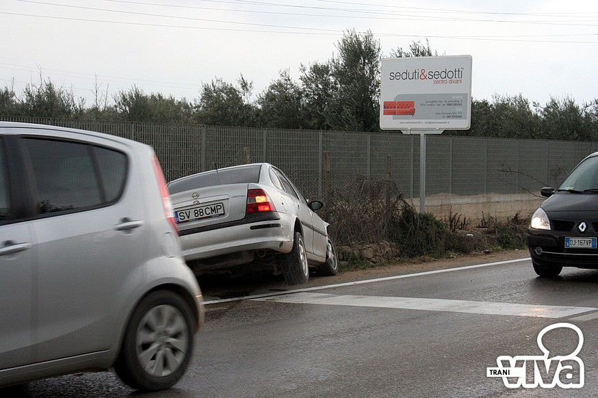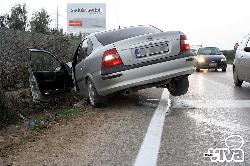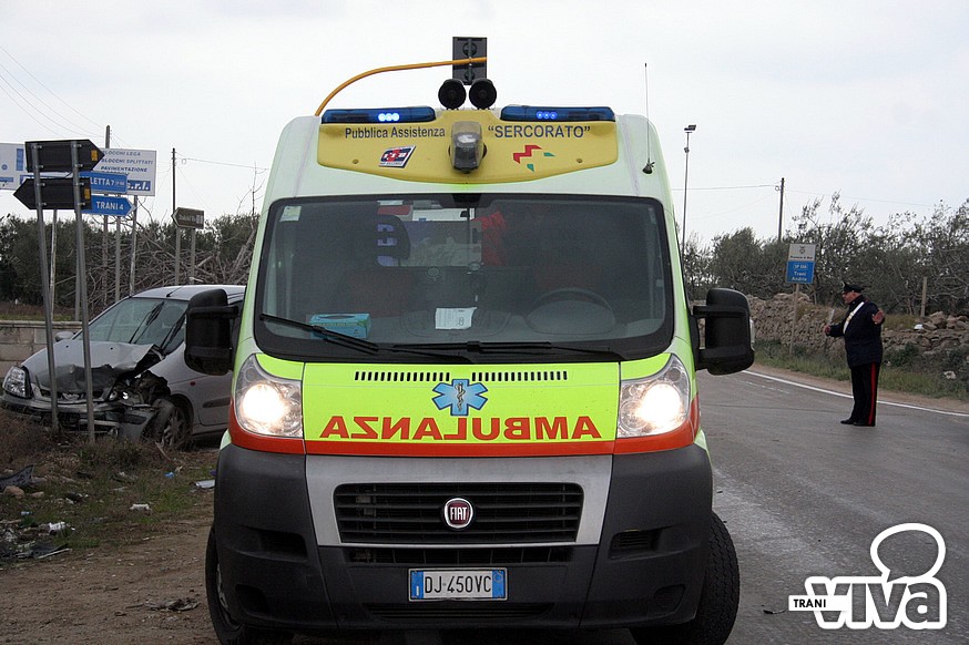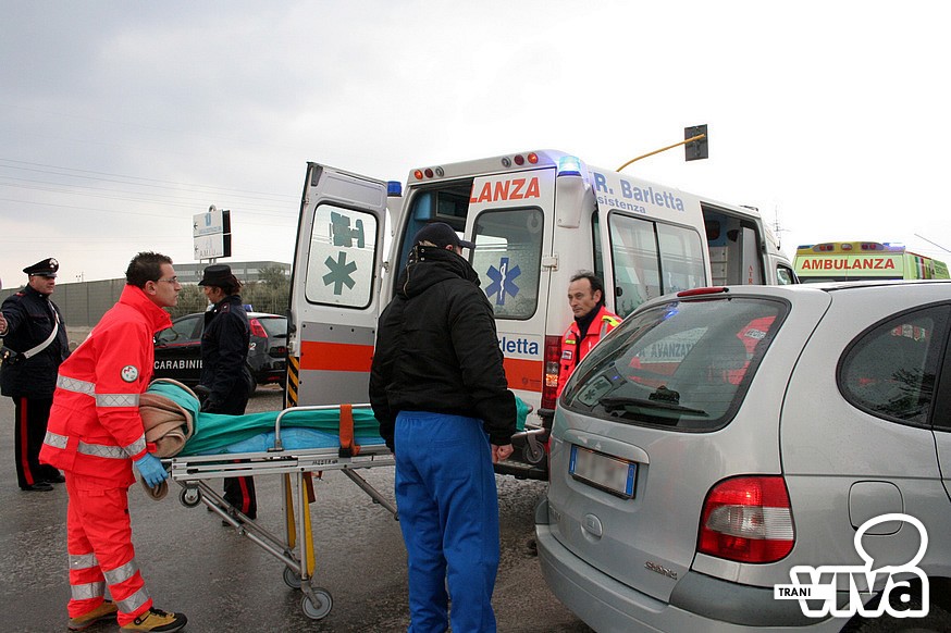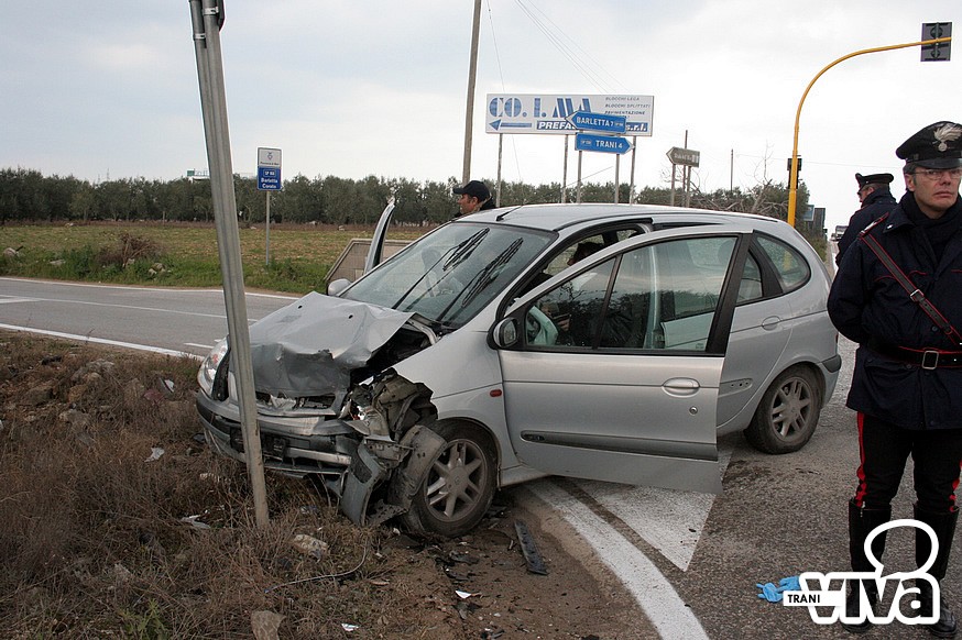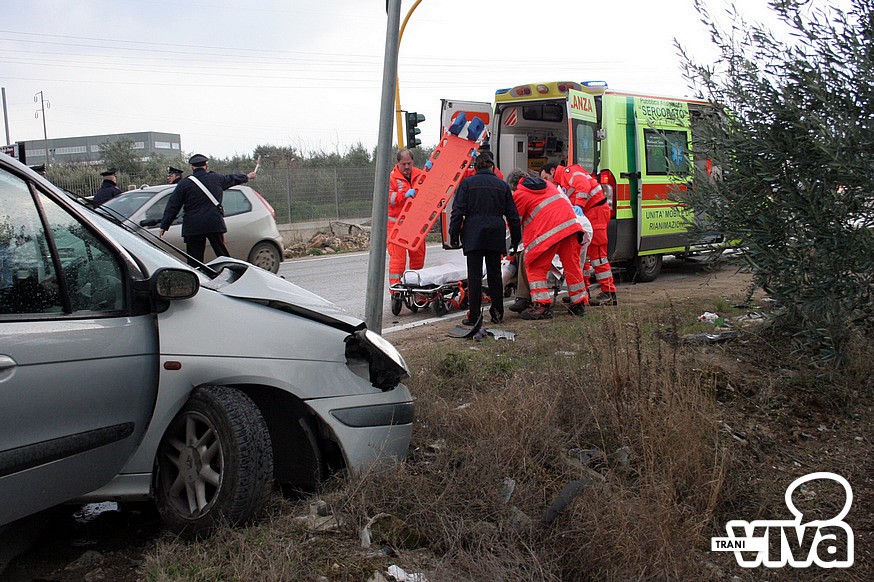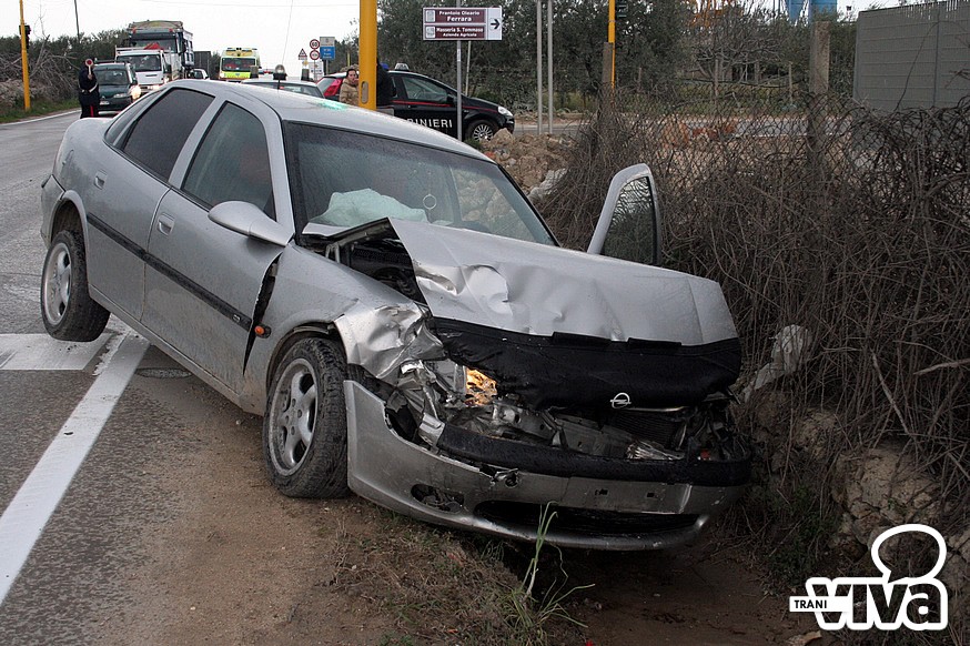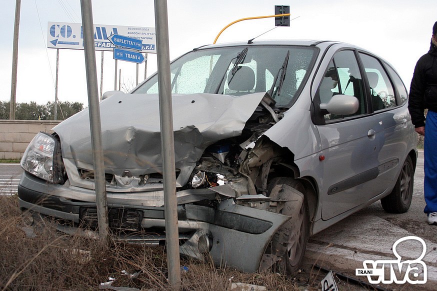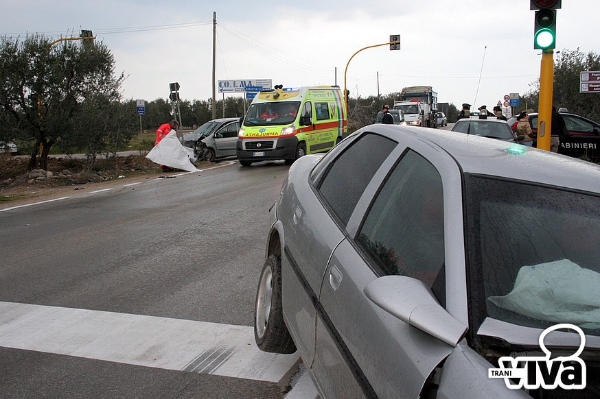 Lo scontro è avvenuto all'altezza dell'incrocio per la discarica di Trani. Un'auto è passata nonostante il semaforo rosso, scontrandosi con un'altra vettura che sopraggiungeva nella direzione opposta. Le vetture coinvolte sono una Opel Vectra ed una Renault Scenic. Sul posto sono intervenuti i Carabinieri di Andria ed il 118 di Trani, Corato e Barletta.