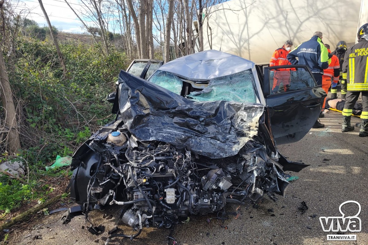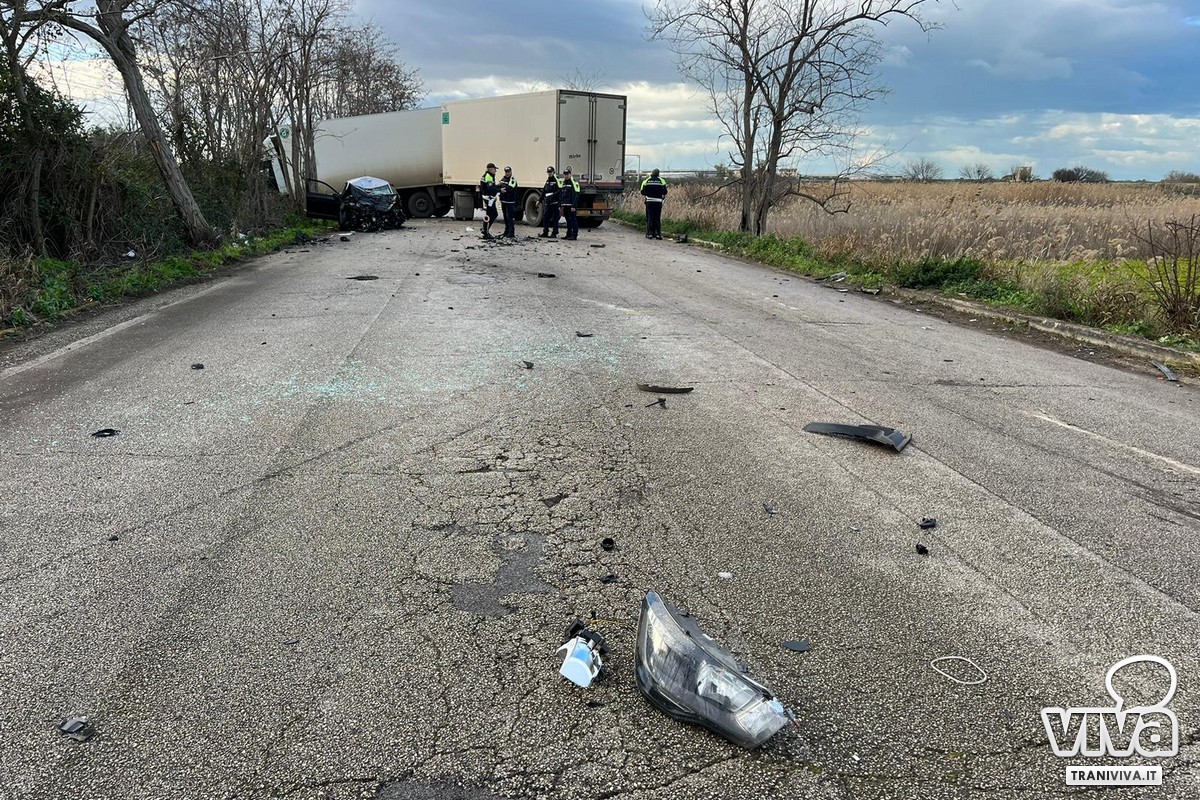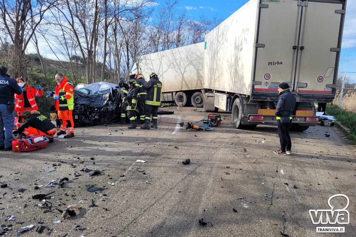 Il violento impatto, un frontale, è avvenuto tra un autoarticolato e una vettura che sarebbe finita contro il mezzo pesante. Un uomo di 41 anni, Nicola Partucci, barlettano, che viaggiava a bordo dell'auto è deceduto sul colpo: un'altra persona, una donna che viaggiava a bordo della stessa auto, andata quasi completamente distrutta, a seguito delle ferite riportate, è stata trasportata in codice rosso all'ospedale di Bonomo dove è stata sottoposta ad intervento chirurgico.
