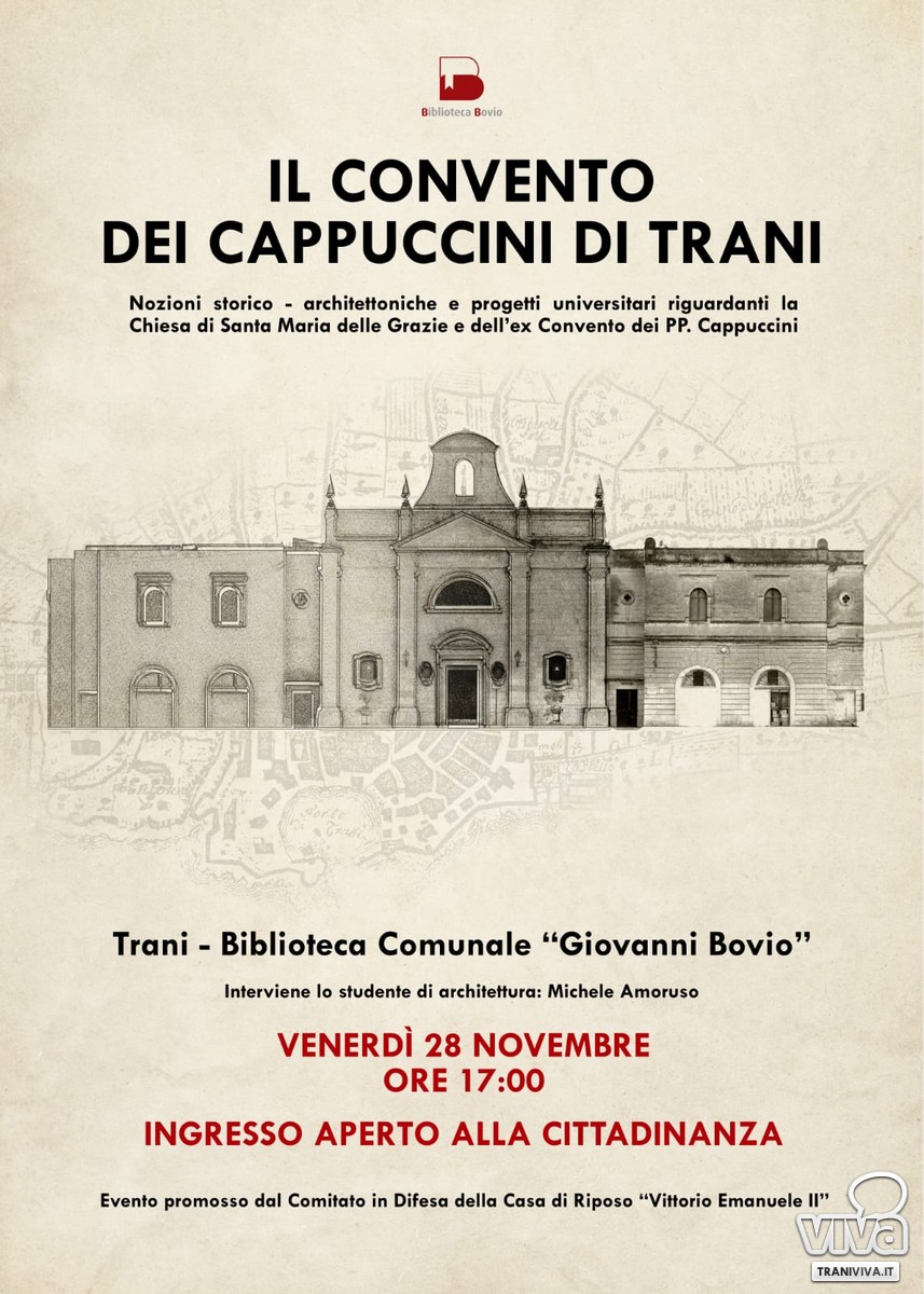 La Biblioteca Comunale "Giovanni Bovio" di Trani ospita un incontro dedicato alla storia e alla valorizzazione del complesso della chiesa e del convento dei Cappuccini, un luogo che intreccia memoria religiosa, architettonica e civile della città.