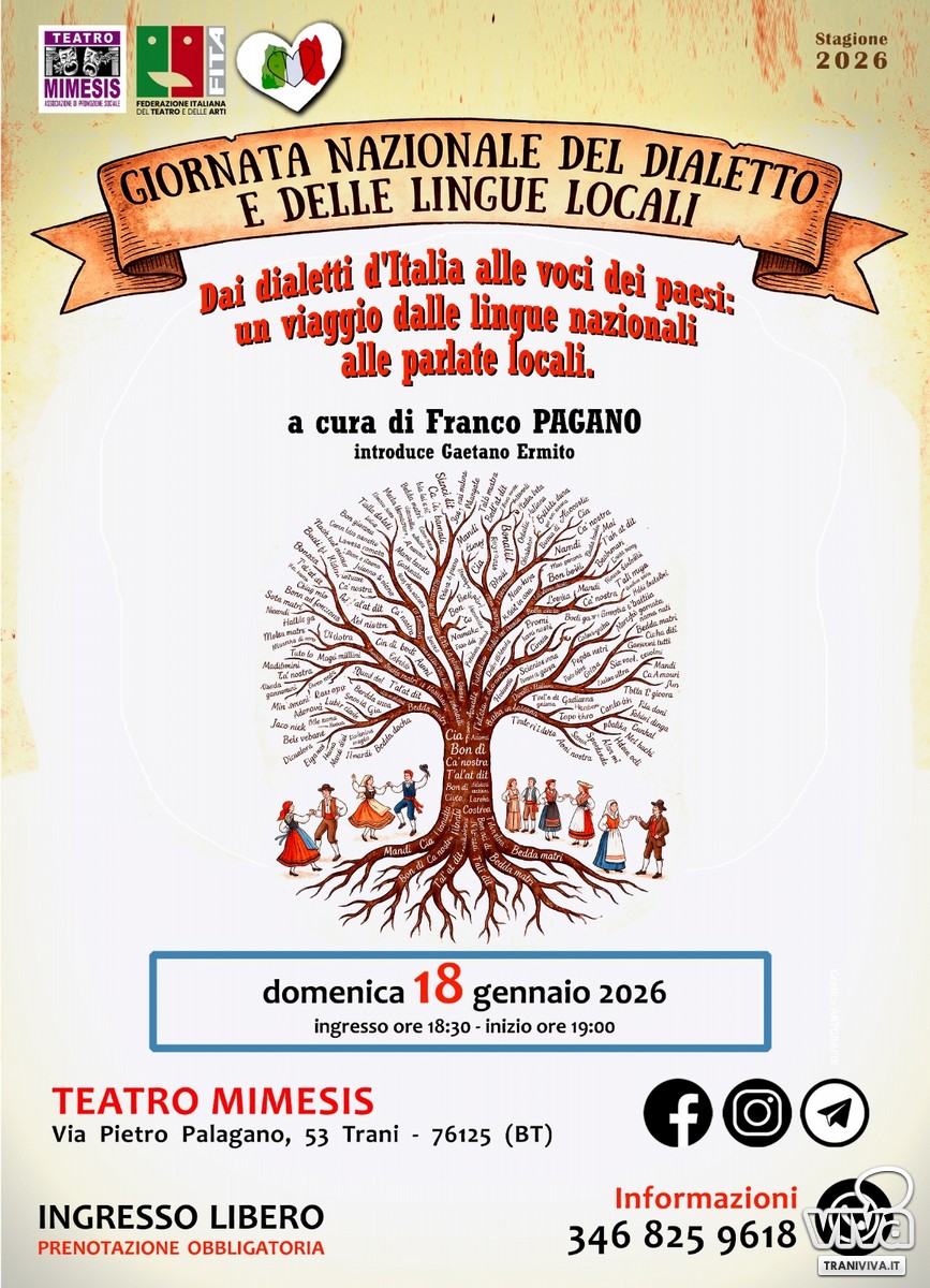 In occasione della Giornata Nazionale del Dialetto e delle Lingue Locali, il Teatro Mimesis APS, il prossimo 18 gennaio, apre le sue porte per una serata speciale dedicata alla riscoperta delle nostre radici linguistiche. L'evento, pensato come un momento di ascolto e riflessione, punta a valorizzare la ricchezza dei territori attraverso le parole che ne hanno scritto la storia.