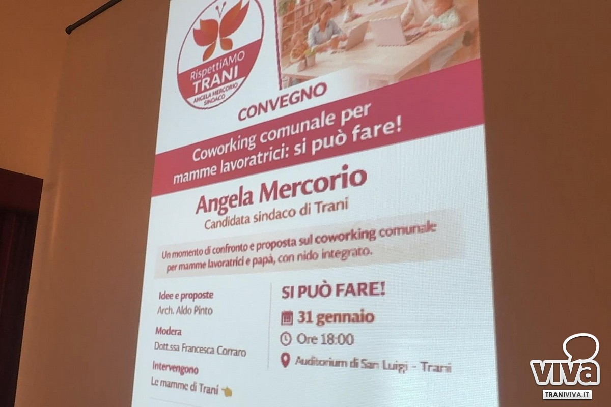 Le luci dell'Auditorium di San Luigi si sono accese lo scorso 31 gennaio su una sfida ambiziosa, ma necessaria: trasformare Trani in una città dove carriera e genitorialità non siano più in conflitto. Sotto lo slogan "Si può fare!", la candidata sindaco Angela Mercorio ha presentato un progetto che promette di rivoluzionare il welfare locale: un coworking comunale con nido integrato un'idea nata dopo una attenta analisi tecnica e umana del contesto cittadino. L'incontro, moderato dalla dott.ssa Francesca Corraro, chiara la sua presentazione del tema introdotto, ha visto la partecipazione dell'architetto Aldo Pinto, che ha illustrato in maniera efficace la fattibilità preliminare dell'opera da strutturare in immobili comunali e pensata a misura di persona. Presenti anche mamme tranesi anch'esse protagoniste di una progettazione partecipata ritenuta essenziale per intercettarne i bisogni.