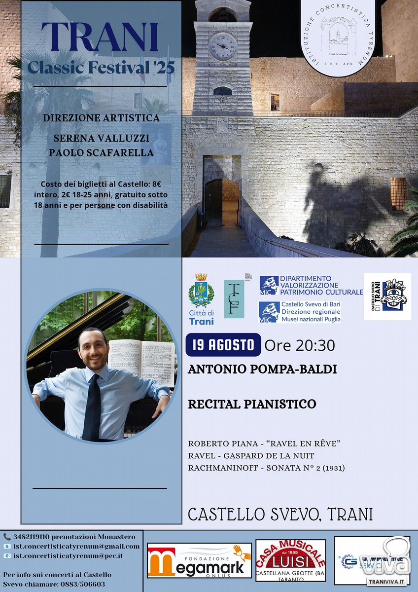 Dopo l'inaugurazione al Castello Svevo con i Maestri Enrico Pace e Igor Roma lo scorso 2 agosto e il secondo acclamato concerto al Monastero di Colonna il 9 agosto, con i Maestri Serena Valuzzi, Cristina Di Lecce, Leonardo Colafelice e Paolo Scafarella, il Trani Classic Festival torna al Castello Svevo per il prossimo appuntamento.