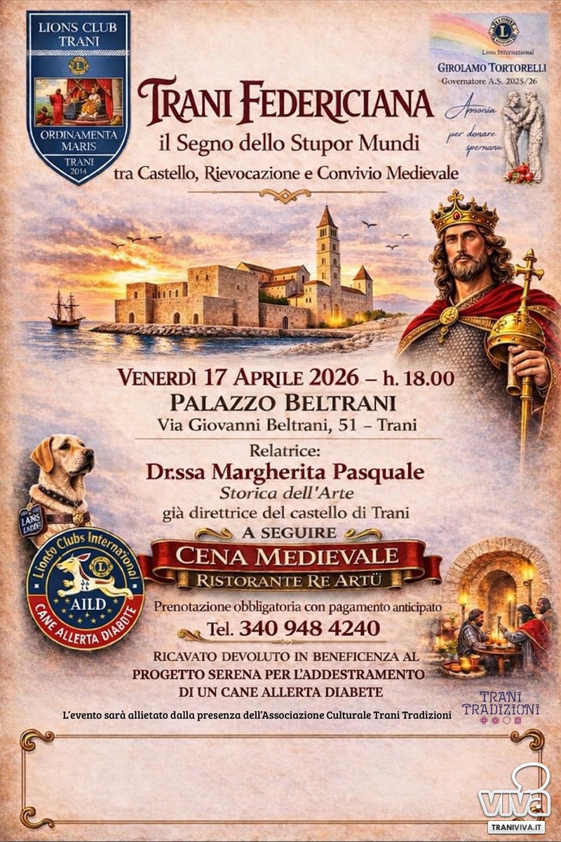 Sarà un tuffo nel passato, tra cultura, tradizione e impegno sociale, l'evento "Trani Federiciana: il Segno dello Stupor Mundi, tra castello, rievocazione e convivio medievale", in programma venerdì 17 aprile 2026 alle ore 18.00 presso Palazzo Beltrani, nel cuore di Trani, con prosecuzione della serata al ristorante Re Artù.