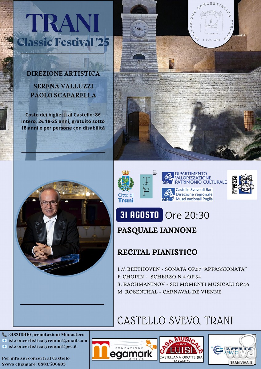 Cala il sipario sulla II edizione del Trani Classic Festival, e lo fa con un evento di straordinario prestigio: questa sera, domenica 31 agosto ore 20:30, le antiche pietre del Castello Svevo vibreranno sotto le note di uno dei più grandi pianisti della scena internazionale, il Maestro Pasquale Iannone: un appuntamento imperdibile che chiude una rassegna di successo capace di portare a Trani, grazie ai M° Serena Valluzzi e Paolo Scafarella, Direttori artistici del Festival, l'eccellenza della musica classica in luoghi di incomparabile bellezza.
