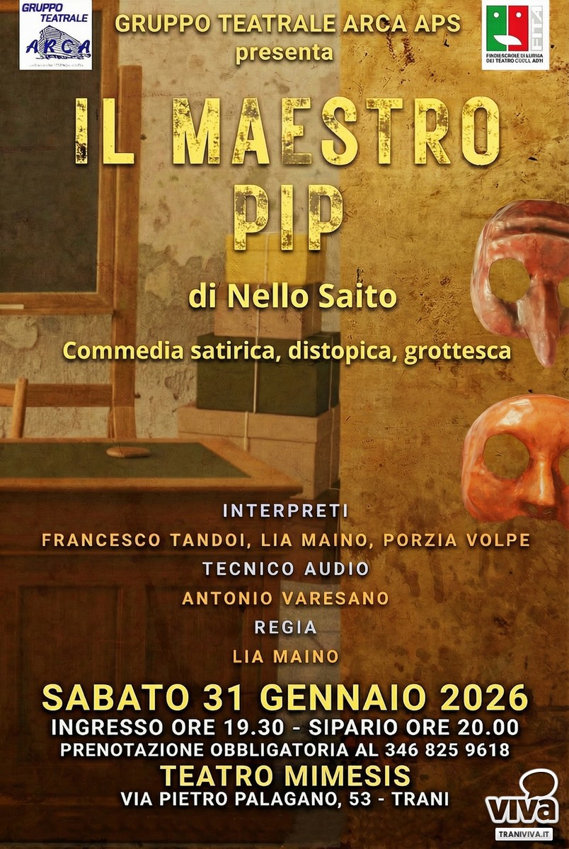 Quando il teatro si fa specchio deformante della realtà, il risultato è un'esperienza che scuote e diverte allo stesso tempo. È quanto accaduto lo scorso 31 gennaio sul palco del Teatro Mimesis APS, che ha ospitato la storica compagnia coratina ARCA APS (FITA). Un appuntamento atteso che, per l'occasione, ha visto la partecipazione non solo degli associati ma di un folto pubblico proveniente anche dalle città limitrofe, riunito per assistere alla messinscena de "Il Maestro Pip" di Nello Saito.