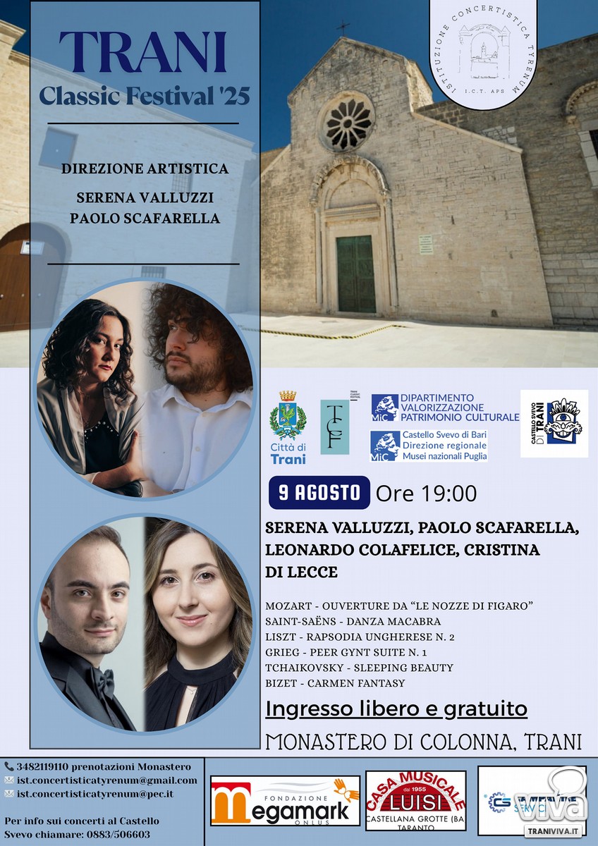La seconda edizione del Trani Classic Festival continua la sua missione di unire la grande musica classica alla valorizzazione del patrimonio artistico e culturale del territorio, il concerto di Colafelice e Di Lecce, Serena Valluzzi e Paolo Scafarella, è un ulteriore tassello di un programma che si preannuncia ricco di talento e passione: il concerto che si terrà nel suggestivo scenario del Monastero di Colonna, sarà un appuntamento che celebrerà il talento, la bellezza del nostro territorio e la magia della musica classica.
