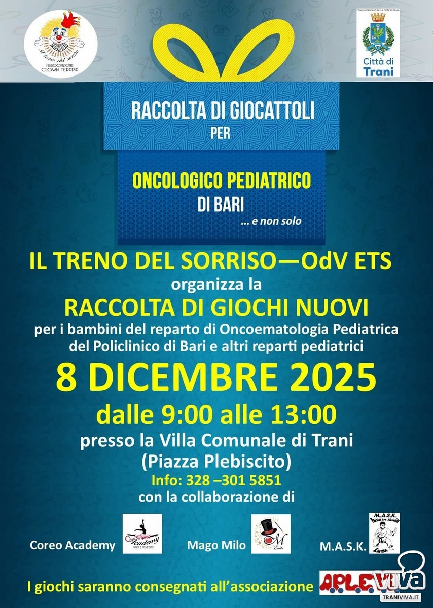 La Città di Trani torna a stringersi attorno ai bambini che affrontano la battaglia più difficile. Oggi, 8 dicembre c'è tempo fino alle 13:00, la Villa Comunale si trasforma in un grande abbraccio collettivo grazie alla manifestazione solidale organizzata dall'associazione di clownterapia "Il Treno del Sorriso – OdV ETS", giunta ormai alla sua nona edizione. L'iniziativa invita tutti – famiglie, ragazzi, nonni, scuole, gruppi e semplici passanti – a fare un gesto tanto semplice quanto prezioso: donare un gioco nuovo destinato ai piccoli pazienti del reparto di Oncoematologia Pediatrica e di altri reparti del Policlinico di Bari. Un dono capace di portare luce, distrazione e un sorriso in un reparto in cui ogni giorno si combatte con coraggio.