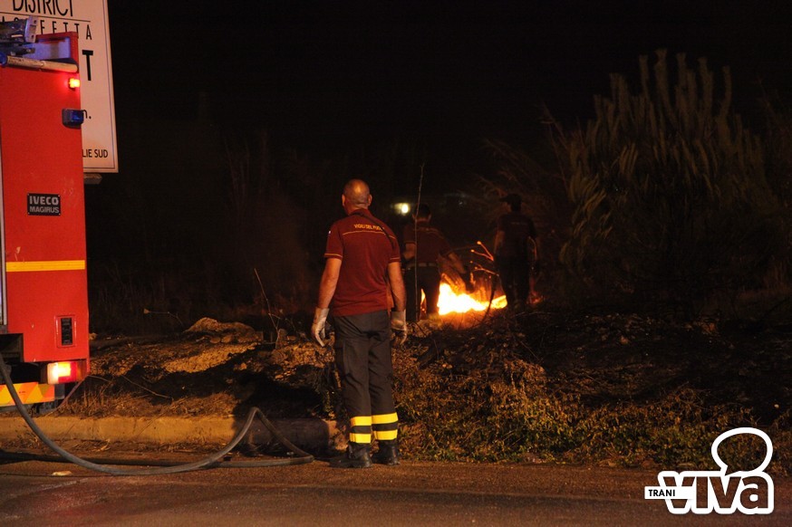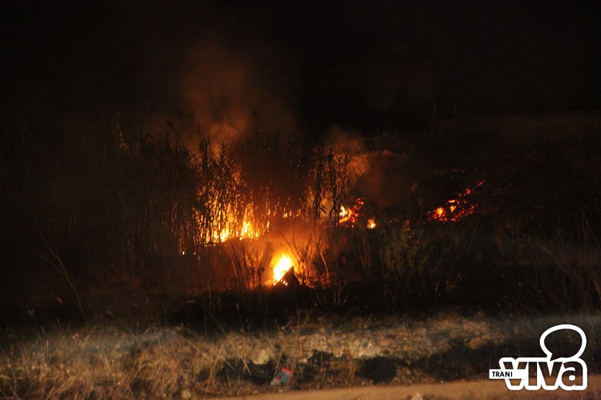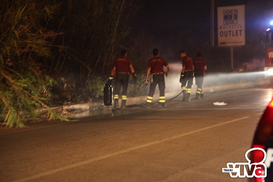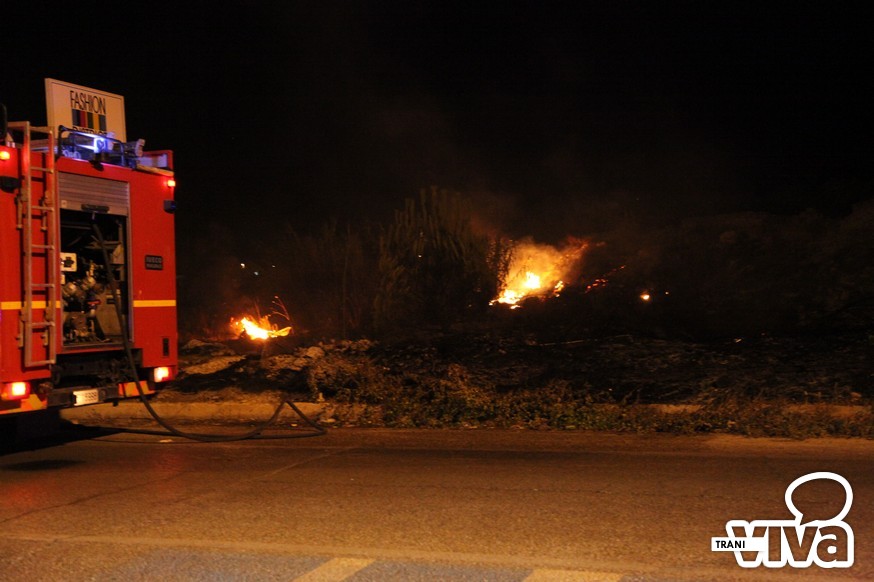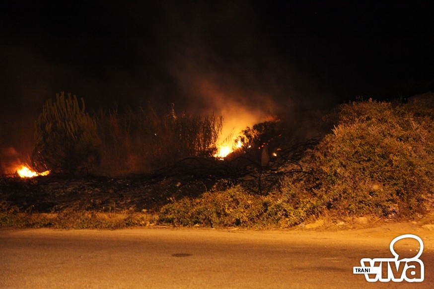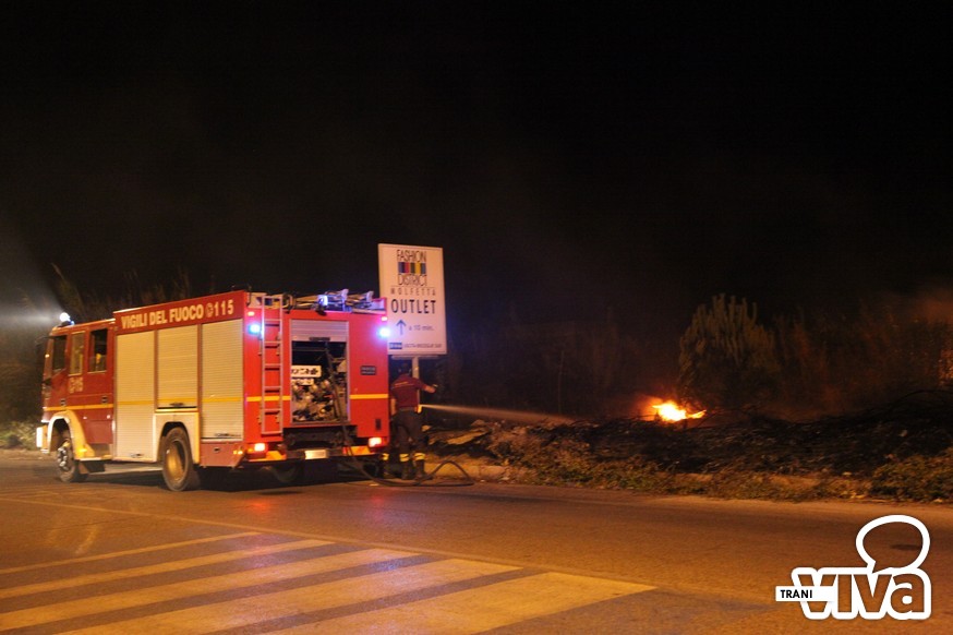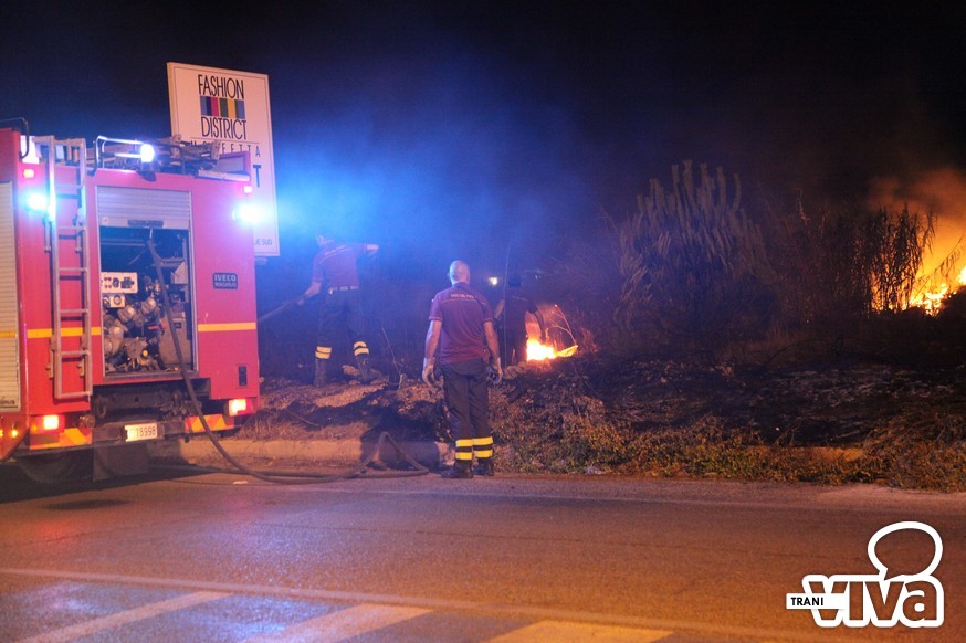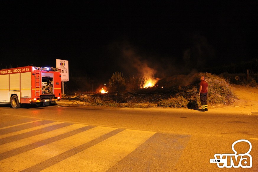 I Vigili del Fuoco sono intervenuti questa notte sul territorio di Trani per spegnere un vasto incendio di sterpaglie e di canne che si è sviluppato intorno alle 23.00 sulla strada statale per Bisceglie, qualche centinaia di metri dopo la seconda spiaggia. Tra la vegetazione in fiamme i pompieri hanno rinvenuto una bombola di gas che è stata raffreddata con l'acqua lanciata a pressione per evitare una possibile esplosione.