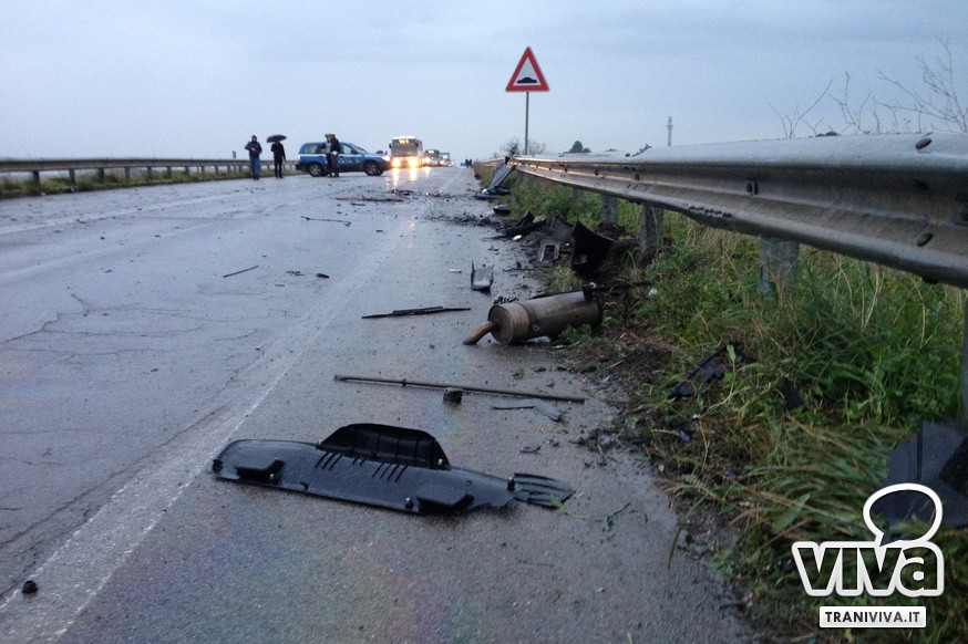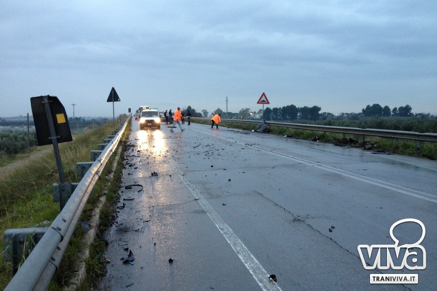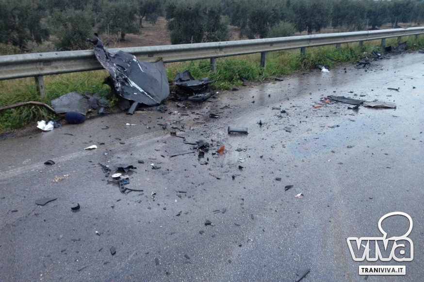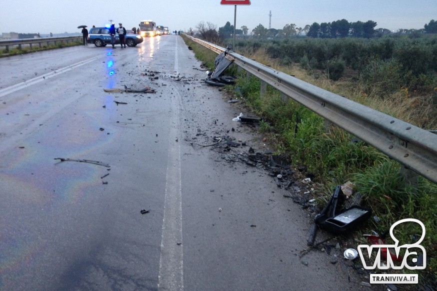 Nel violento incidente, che ha causato la chiusura al traffico della strada, sono rimasti ferite tre persone. La donna alla guida dell'autovettura è in condizioni più gravi ed è stata trasportata all'ospedale di Andria. Sul posto sono intervenute le squadre del 118 di Trani e Corato. Polizia stradale e Carabinieri hanno mantenuto chiuso il tratto di strada interessato per la presenza di detriti e sostanze oleose. La circolazione è stata riaperta solo intorno alle 16.30 dopo l'intervento di una squadra specializzata per la pulizia dell'asfalto, reso viscido da benzina e sostanze oleose.