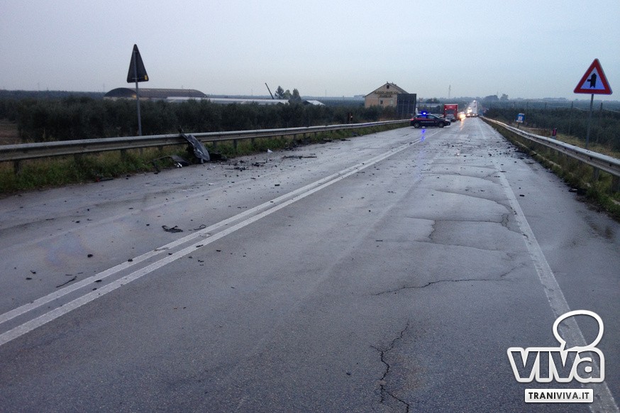 Grave incidente stradale sulla provinciale Trani-Corato. Intorno alle 14.00 di oggi due autoarticolati e due autovetture si sono scontrate nei pressi del cavalcavia autostradale. Tre dei quattro mezzi coinvolti (un'auto e due autoarticolati) viaggiavano in direzione Corato quando hanno impattato, con una dinamica ancora da accertare, con un'auto che viaggiava in direzione Trani.