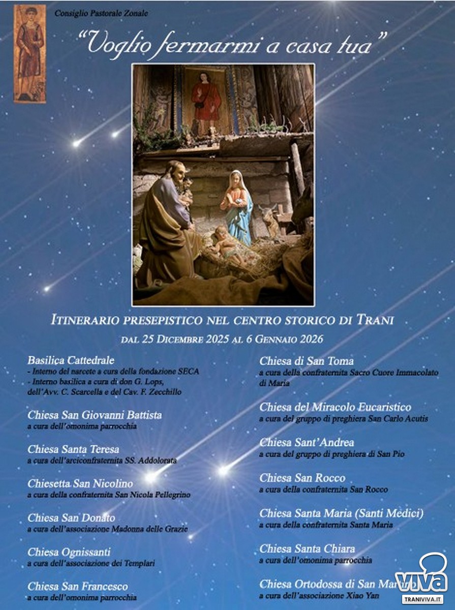 "Voglio fermarmi a casa tua" è il titolo scelto per I'itinerario presepistico che dal 15 dicembre al 06 gennaio caratterizzerà, come da tradizione, il centro storico di Trani e le Chiese che ospiteranno la e Sacre Rappresentazioni che ogni anno stupiranno per le diverse scenografie dedicate alla Natività. Ecco il percorso:
