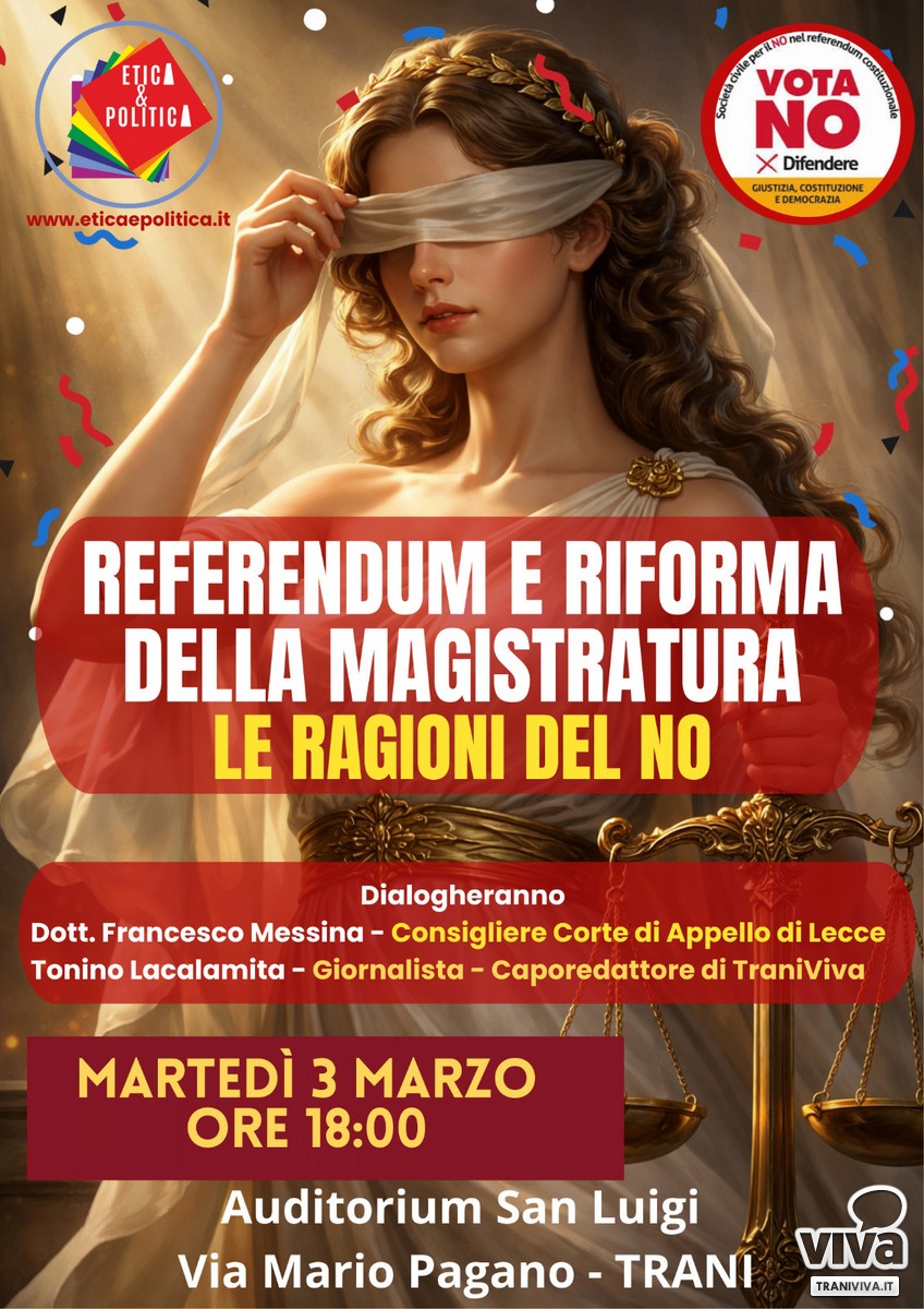 Interverranno il dott. Francesco Messina, Consigliere della Corte di Appello di Lecce, ed Tonino Lacalamita, giornalista e caporedattore di TraniViva. I saluti del Comitato per il NO saranno affidati alla sig.ra Francesca Bruno.