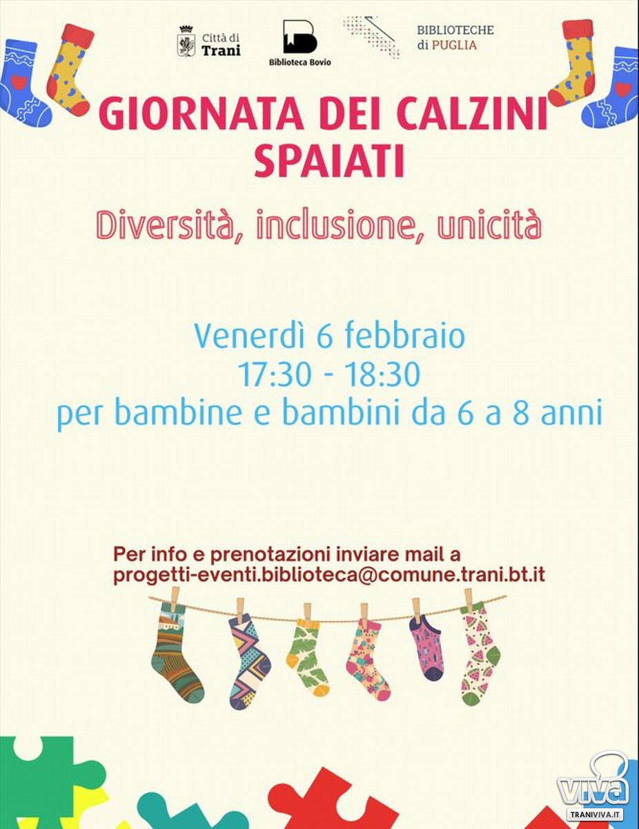 Per la partecipazione è necessaria la prenotazione inviando una mail all'indirizzo progetti-eventi.biblioteca@comune.trani.bt.it indicando nome, cognome, età. Come i calzini spaiati, siamo tutti diversi e dobbiamo imparare ad accettarci per ciò che siamo e apprezzare quello che ci rende unici: la diversità è una ricchezza, non un problema. Inoltre, per tutto il giorno chi vuole può venire in biblioteca, scattarsi una foto con i calzini spaiati, postarla e taggarla sui canali social della biblioteca.