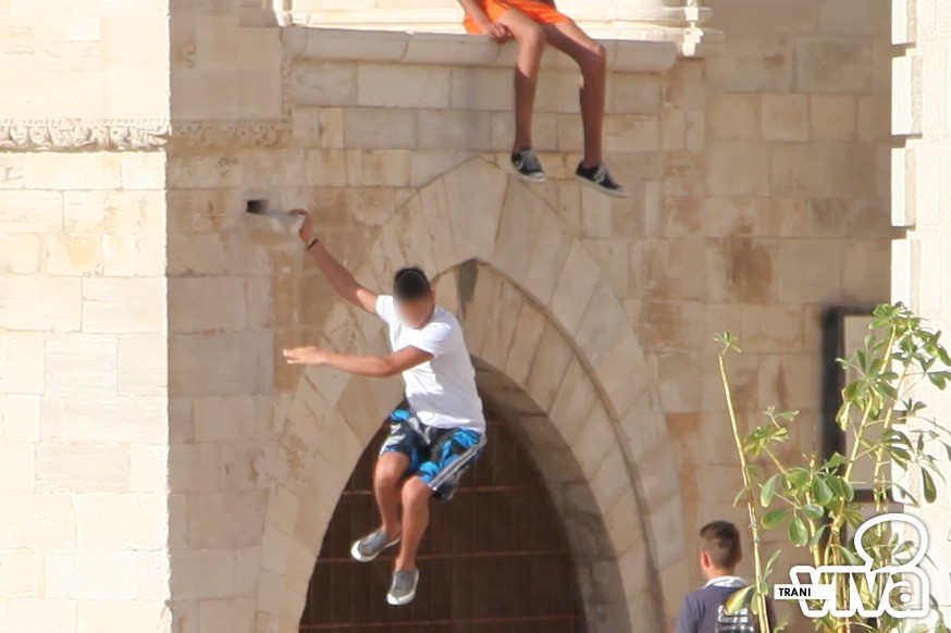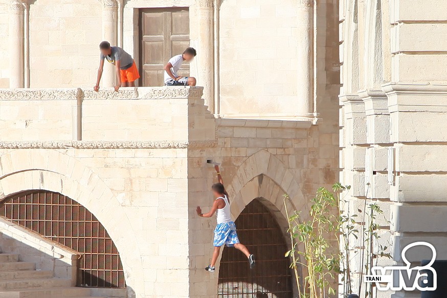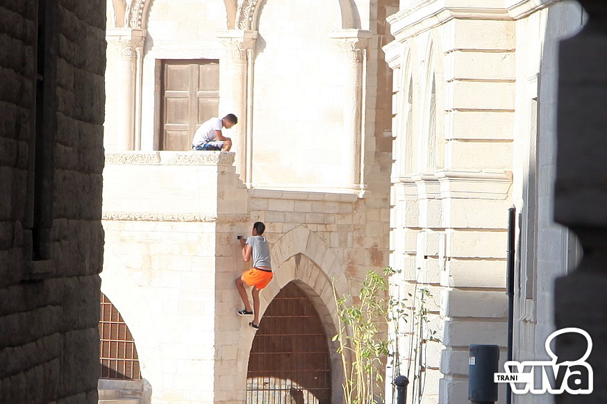 Girando per Trani con macchina fotografica al seguito, capita di imbattersi nelle cose più bizzarre. Il nostro fotografo, da anni impegnato sul campo, è ormai abituato a vederne di cotte e di crude. Questa volta l'obiettivo dell'operatore ha sorpreso le acrobazie di tre giovani che hanno scelto la Cattedrale per cimentarsi in azioni acrobatiche aggrappandosi pericolosamente alla secolare pietra.